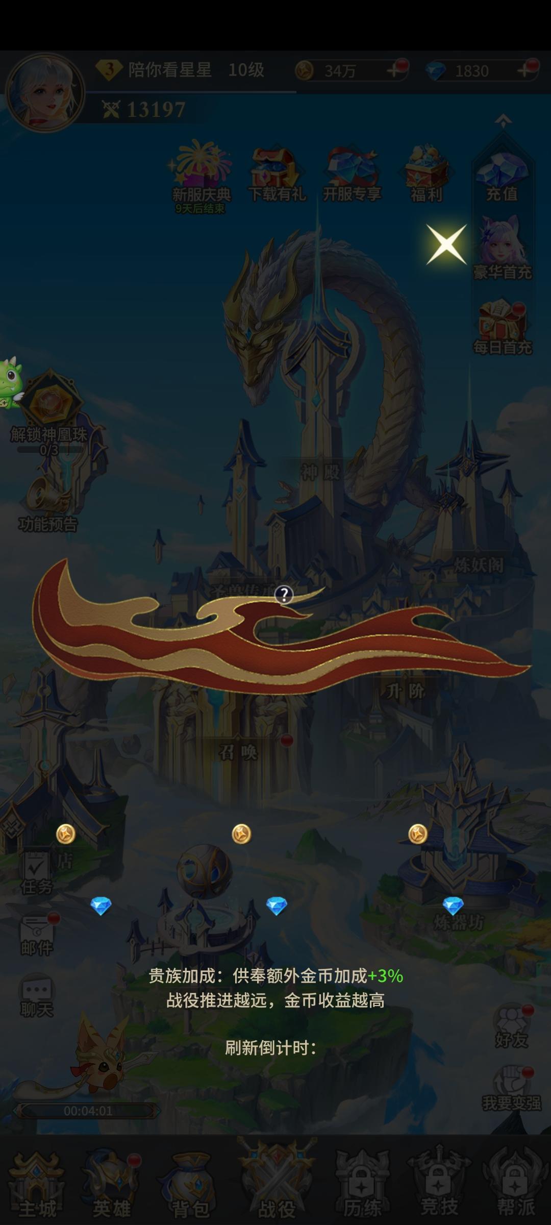 美术是纯2D表现效果,主城界面画风略旧,固定功能入口加上背景图的设计很多年前就有,并没有让人眼前一亮的感觉。界面布局也有点像页游,UI品质倒是不错,有丰富的动态效果。