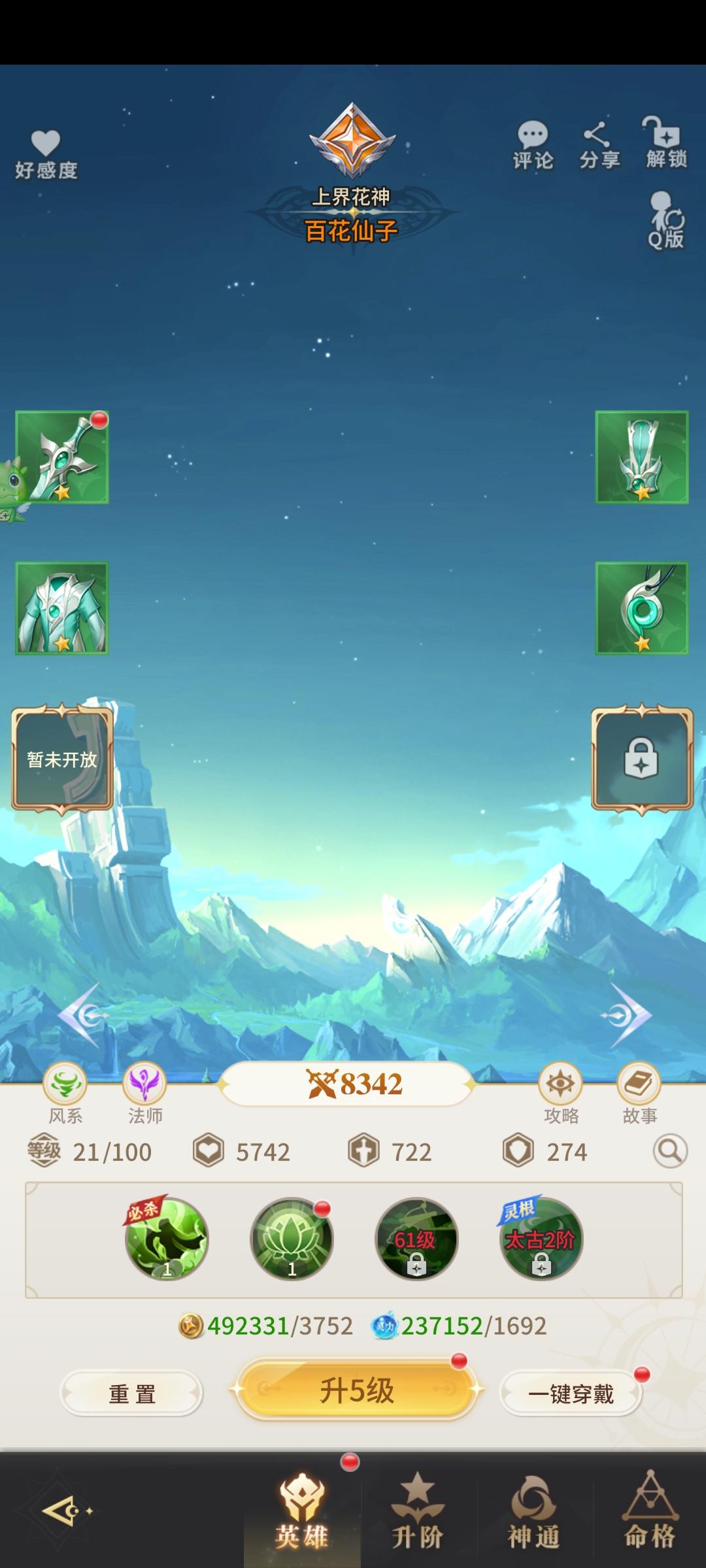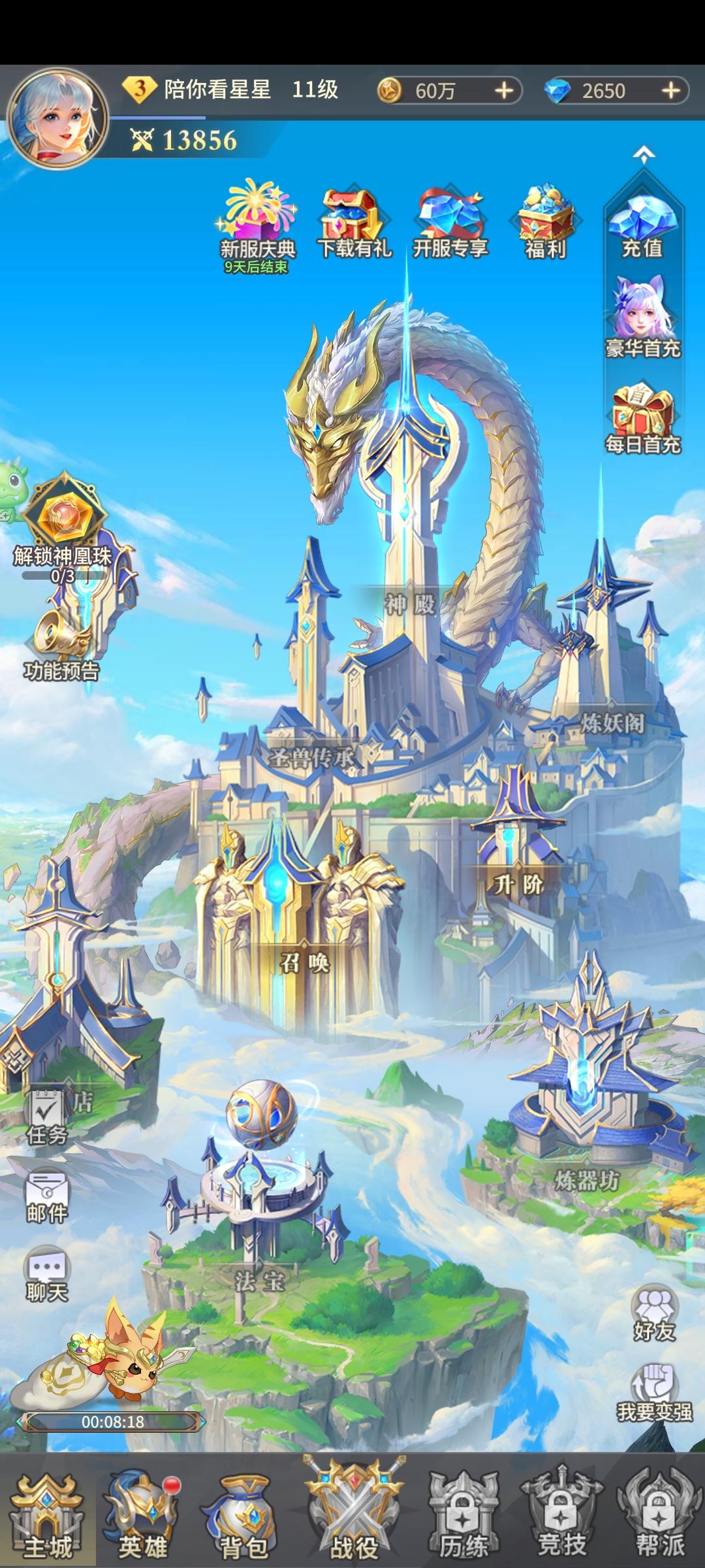 养成内容以英雄为主,总计68个英雄数量不少,单个英雄七条养成线,最大上阵五名。有上阵搭配的策略,同时养成差不多两队。另有一些修仙的养成内容,界面一闪而逝,似乎藏得很隐蔽,或开启条件不足,感觉有混合的成分。