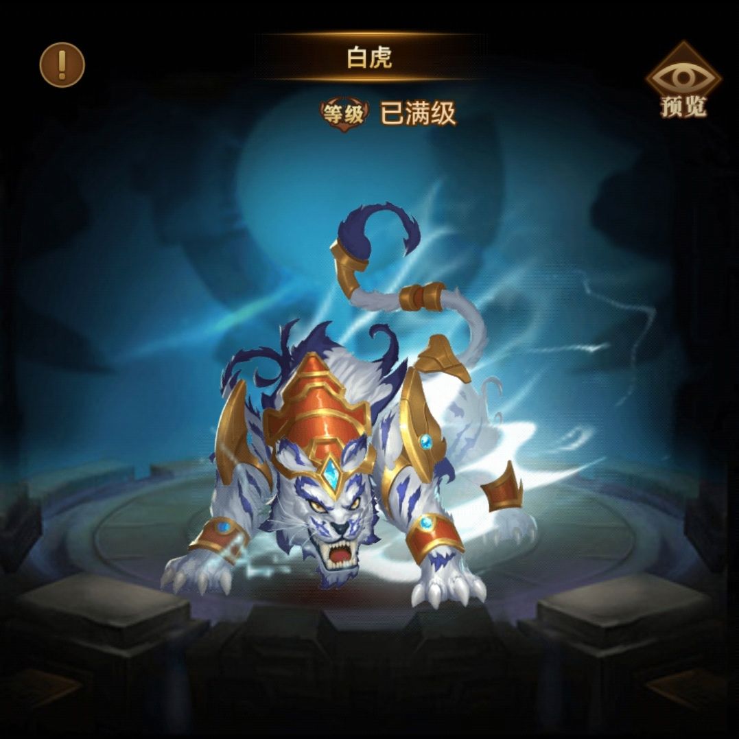 🔹白虎 技能特点: 白虎的技能或许更侧重于单体爆发、防御削弱或特殊效果。例如它可能拥有对敌方单个目标造成高额伤害的技能,能迅速击杀敌方的关键武将,打破敌方的核心阵容;或者它的技能可以降低敌方的防御力,使己方武将对其造成的伤害增加;还有可能具备一些独特的技能效果,如无视敌方一定比例的防御、反弹伤害等。 属性倾向: 白虎的属性可能着重于爆发输出和辅助削弱。其高爆发的输出能力可以在瞬间给敌方关键目标造成