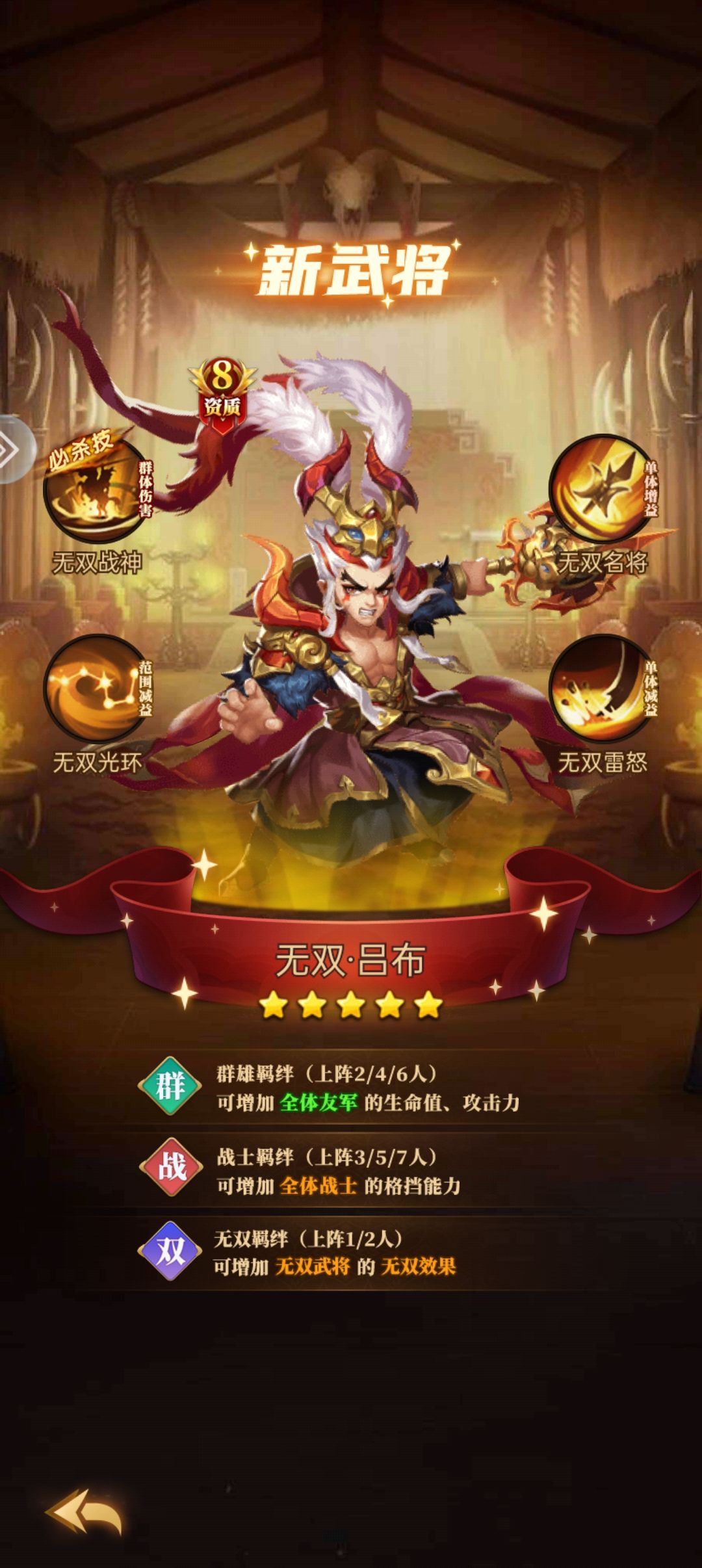这游戏玩了也有快3个月了,开服还在测试就进来了,一直就喜欢这种类型的自走棋,以前的版本军师请布阵也玩过,还真没找到比他更好的自走棋,当然个人观点哈,所以测试就直接进来了,而且策划也是越来越用心,福利也越来越好。废话不多说,给萌新一点小心得,个人认为吕布前期开荒非常不错,所以给大家推荐一下吕布的阵容以及细节。 推荐阵容: 战刺辅,战法辅 推荐同时上场武将:和德川信长组成3战士,德川秀吉加韩信组成3刺