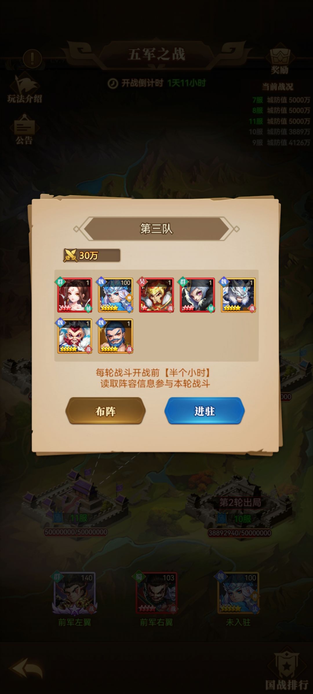 国战进驻不要直接选择本国阵营进驻,那样会进入到预备营,不会出战,就没有荣誉值,也没有击杀次数。要点队伍上面的进驻(图一),绕后选择前军或者后军(图二圈起来的),最后选择左翼或者右翼,这个无所谓(图三)#天天三国