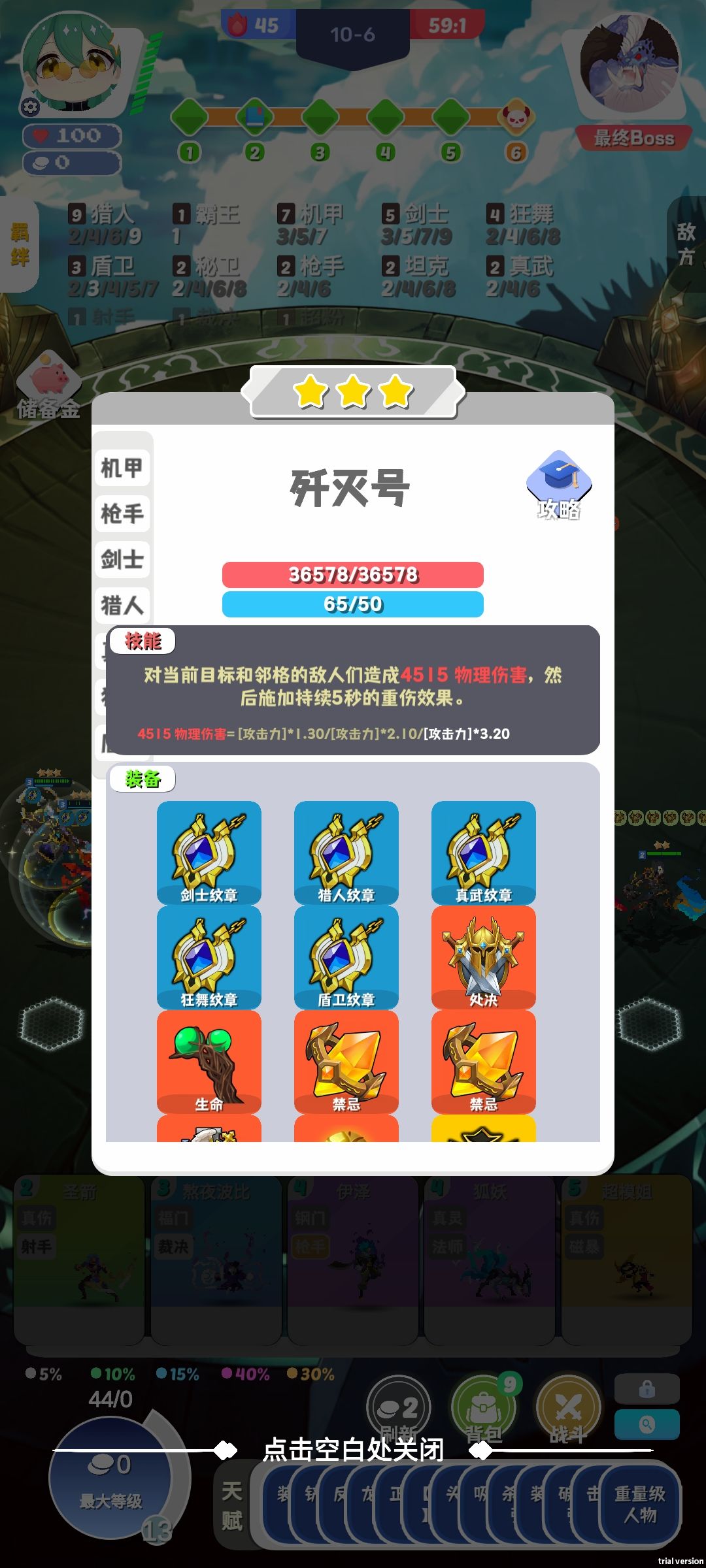 忘记忘记截图了,只有一个boss开完技能之后的属性,和一个通关截图。 也是打了5把,70多血通关。都说最后一关boss难,只要开启十钢,装备神器三个冥火(前提先拿一个金身给主c先保证中期好打)。后面就拿金身和光明夜刃。我的是十钢九猎稳稳过 当然还有另外一种当然还有另外一种方式就是用魔法打败魔法,用boss阵容打他。开减伤害羁绊,当然这套我还没试验过