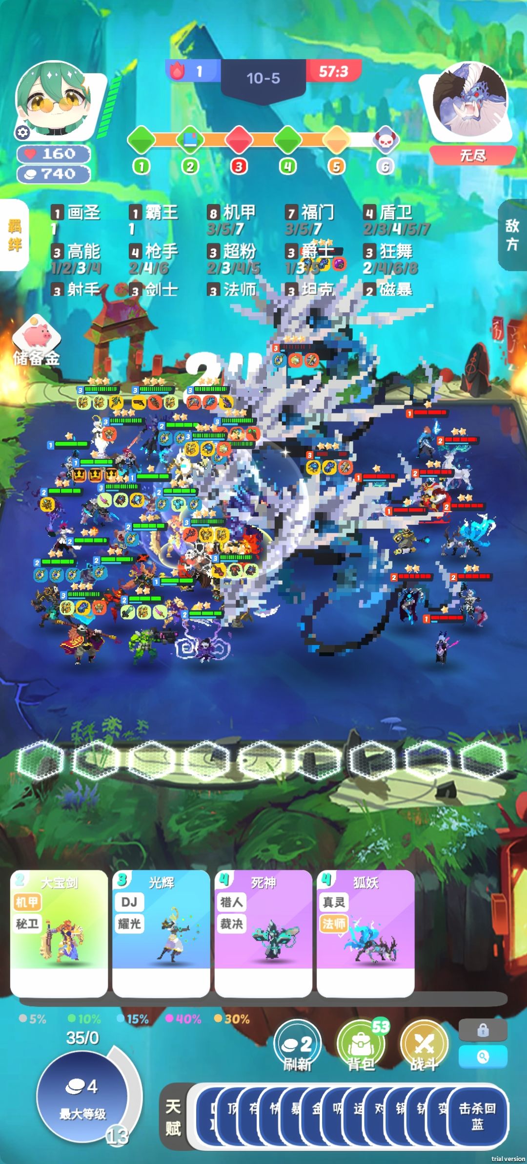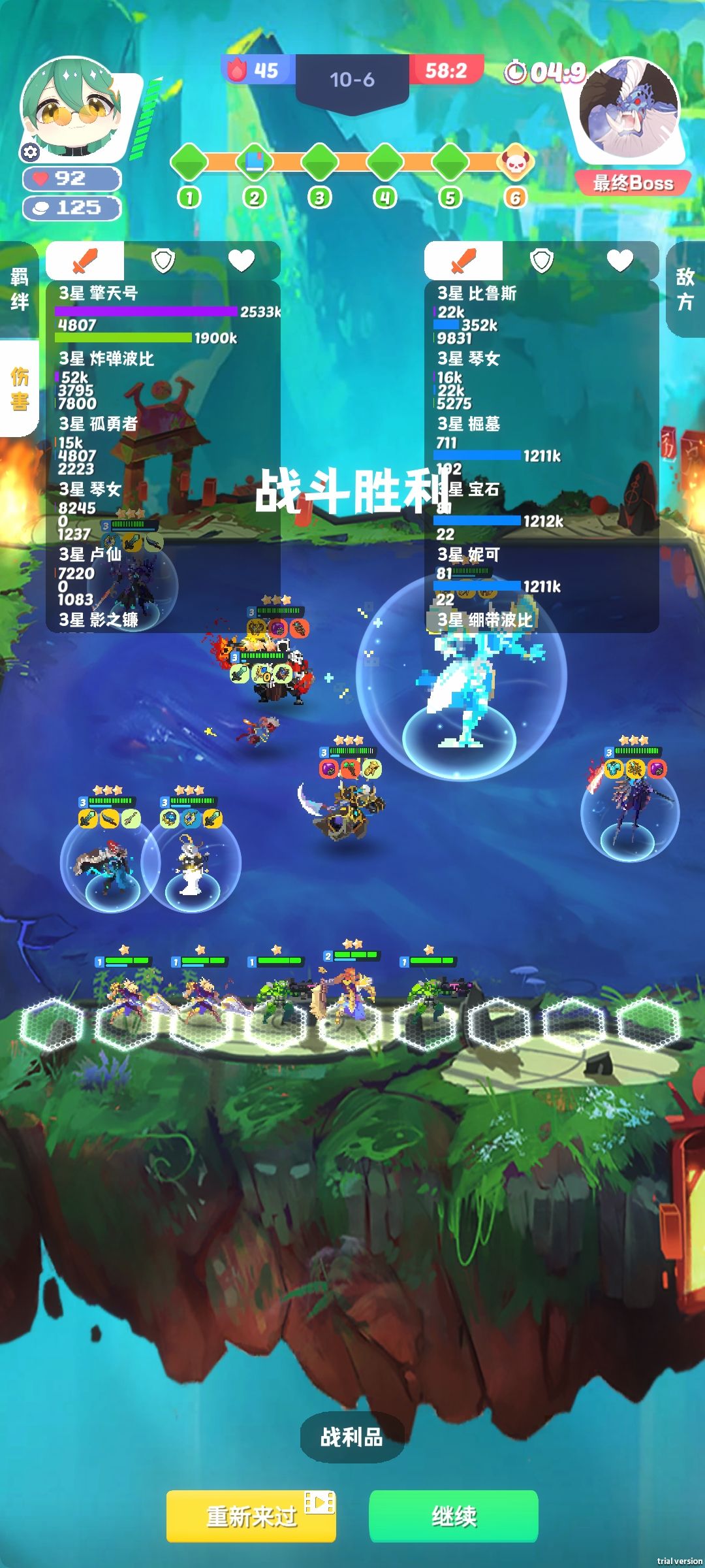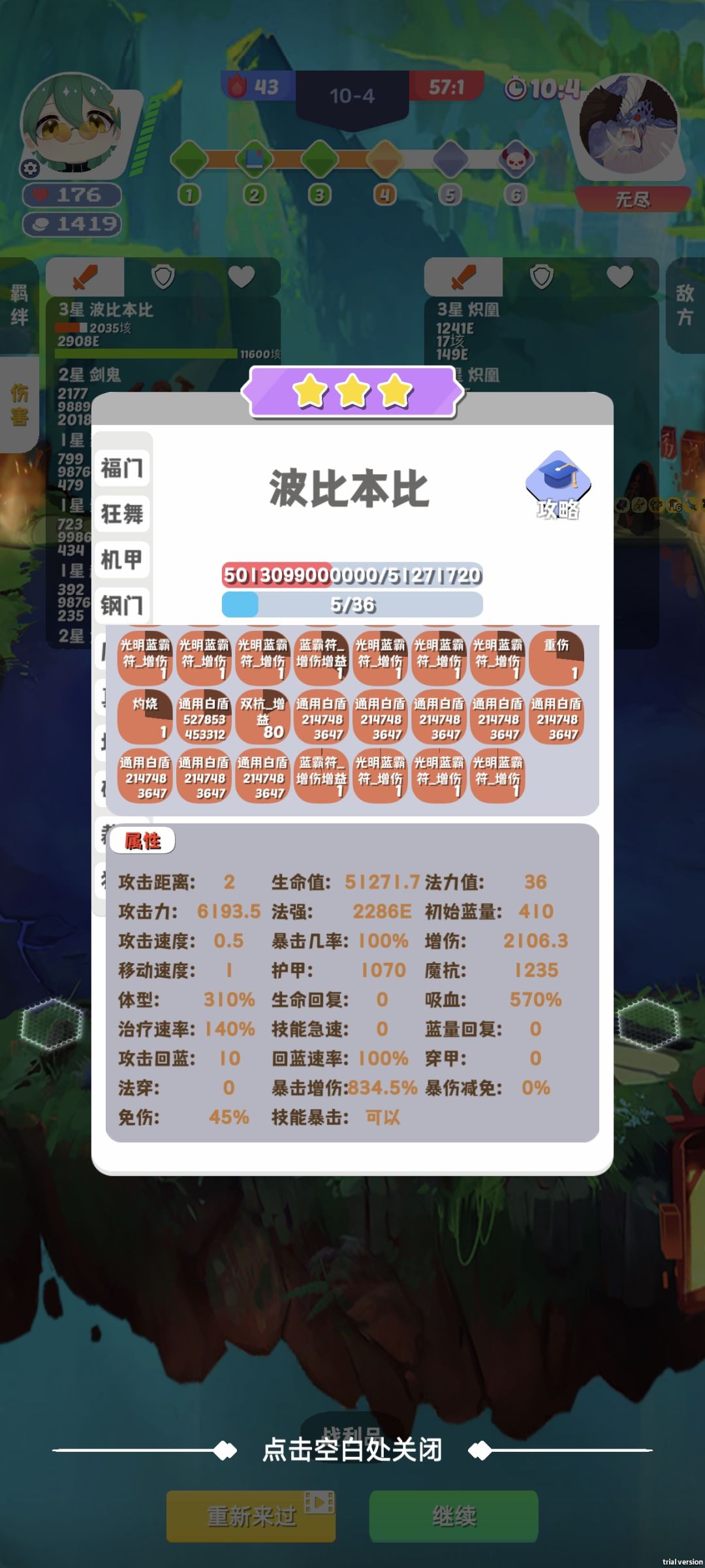 真神波比,这局最高养到200多亿的血。一回合打完差不多2w兆的伤害。 装备禁忌加2个饮血剑(必备饮血剑强化),然后让扭曲力场给波比4个转,分别为:坦克、机甲、真武、盾卫。最后再补齐真灵全队加血。 开局先拿装备重随,然后找饮血剑强化。先凑7福拿铲子,然后凑十刚(福刚越早越好),顺利的话7福十刚5阶段就位。随后先凑3机甲2真武给波比,然后就补齐机甲、真武、坦克、盾卫给波比。最后开9真灵给全队加血。
