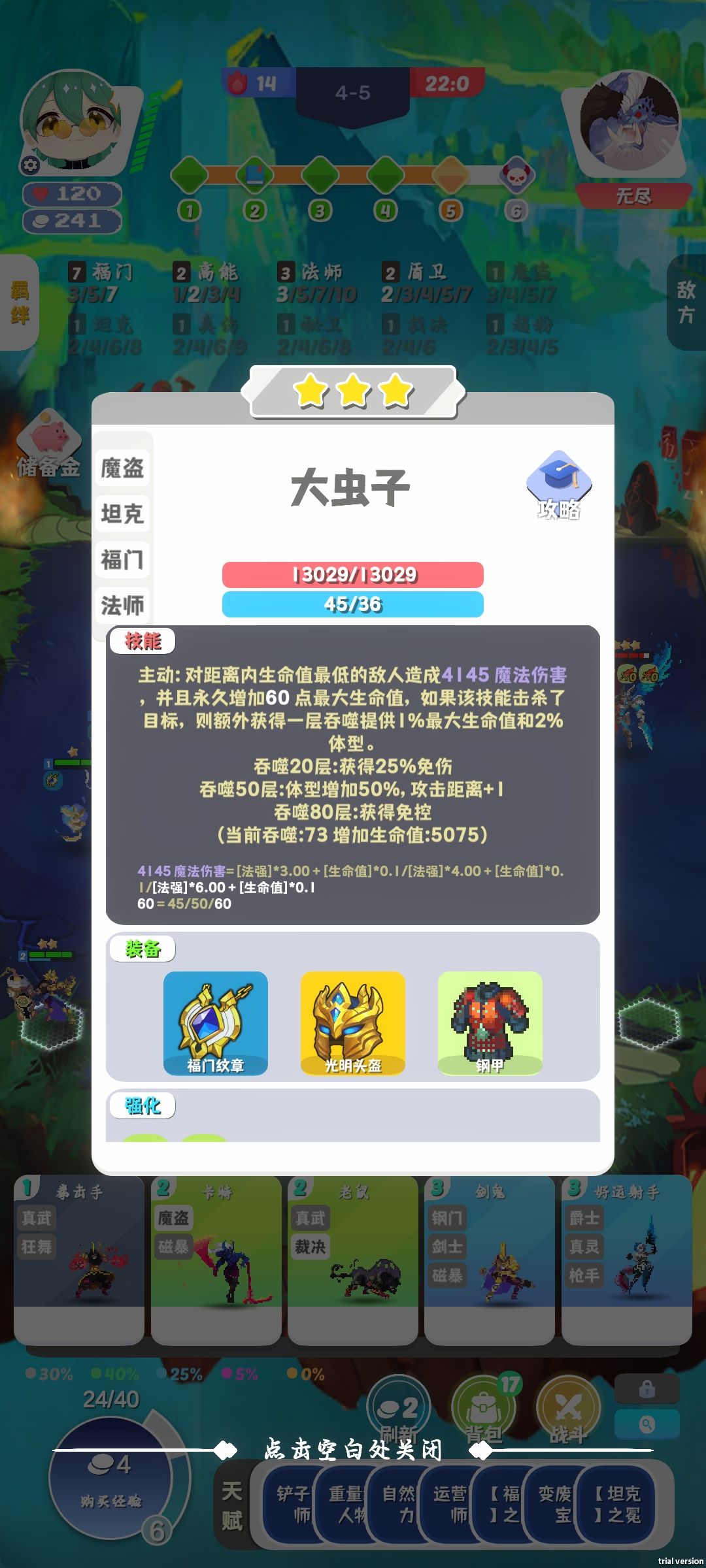 流程。 一、7福门(需要2福门道具)。越早做出来越牛逼,7福门会掉加人口道具和职业道具。 二、7福门+7修士(需要1修士道具)。这时候10人口左右,画圣把1星的都升到3星。 三、7福门+7修士+3机甲。做两个转机甲道具,上劲夫,一个转福门装给劲夫。 四、后面很肥随便搞了。补转坦克道具,装给劲夫饲料。补机甲羁绊。 必选天赋:重量级人物、装备重随 重要天赋:金属大脑 好天赋:击杀回蓝