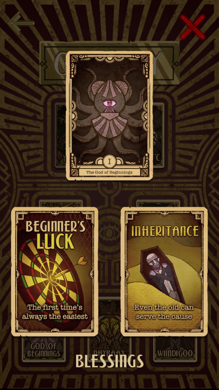 这款游戏对于喜欢coc世界观的人来说绝对是不可错过的佳作。好了,废话也不多说,接下来让我们进行神明科普:第一个是送的章鱼头,左边的luck是三种资源选其中一样获得两张,右边的棺材就是三金钱或者一圣物。其卡牌强制使用(没有跳过)第二个,山羊头,左边的是预知接下来的三张卡牌,需要一张食物支持,右边的是把两张囚徒变成教徒,或者免费获得两教徒和一怀疑值。其卡牌不强制使用(可以跳过)第三个,奈亚子(