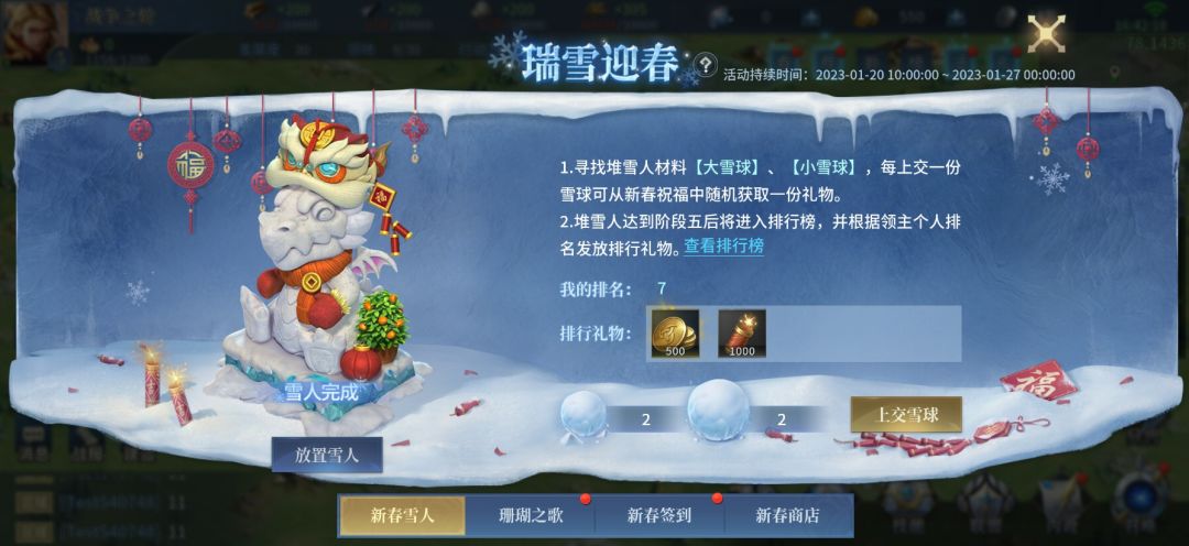 年年辞旧,岁岁迎新。新年将至,《战争之轮》在此提前预祝各位领主大人新年快乐,万事如意!我们也为大家准备了新春特别活动,一起来看看吧~ 同时,新年社区福利活动也正开展中,各位领主大人可不要错过啦~ 活动1:新春雪人 活动时间:2023年1月20日10:00~2023年1月26日24:00 活动介绍: 活动期间,玩家可在主城周围摆放雪人并通过日常获得雪球,上交雪球可装饰自己的雪人增加新春雪人堆建进度