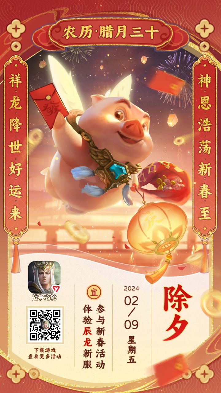 各位领主大人: 万物迎春送残腊,一年终局在今宵。旧岁即将结束,新年马上到来,《战争之轮》项目组全体成员预祝各位领主心想事成,诸事顺意! 神恩浩荡新春至,祥龙降世好运来。正值新春佳节,我们为各位领主准备了丰富的新年礼物,各位领主千万不要错过!农历新年新服“辰龙贺岁”也将于今天11:00开启,欢迎大家前来体验。#战争之轮#游戏推荐#游戏资讯#游戏安利