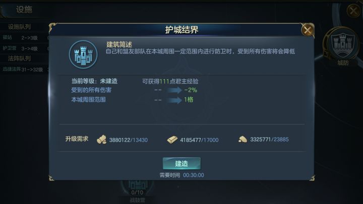 上周分享了君主技能、爵位机制、行动力的相关调整。本周给大家带来开发者手记2,主要包括:城防设施的调整、缘分机制的新增、战报的改版、首占奖励的调整。城防设施调整在之前的版本中,城防类设施的建造率比较低,并且,已经建造城防设施的城市受到攻击时,城防设施的作用比较微弱。鉴于此,策划大大们不仅调整了部分城防设施的效果,还新增加了多种设施,以增强君主们的防守能力,同时增强分城城防设施的战略意义,提升分城
