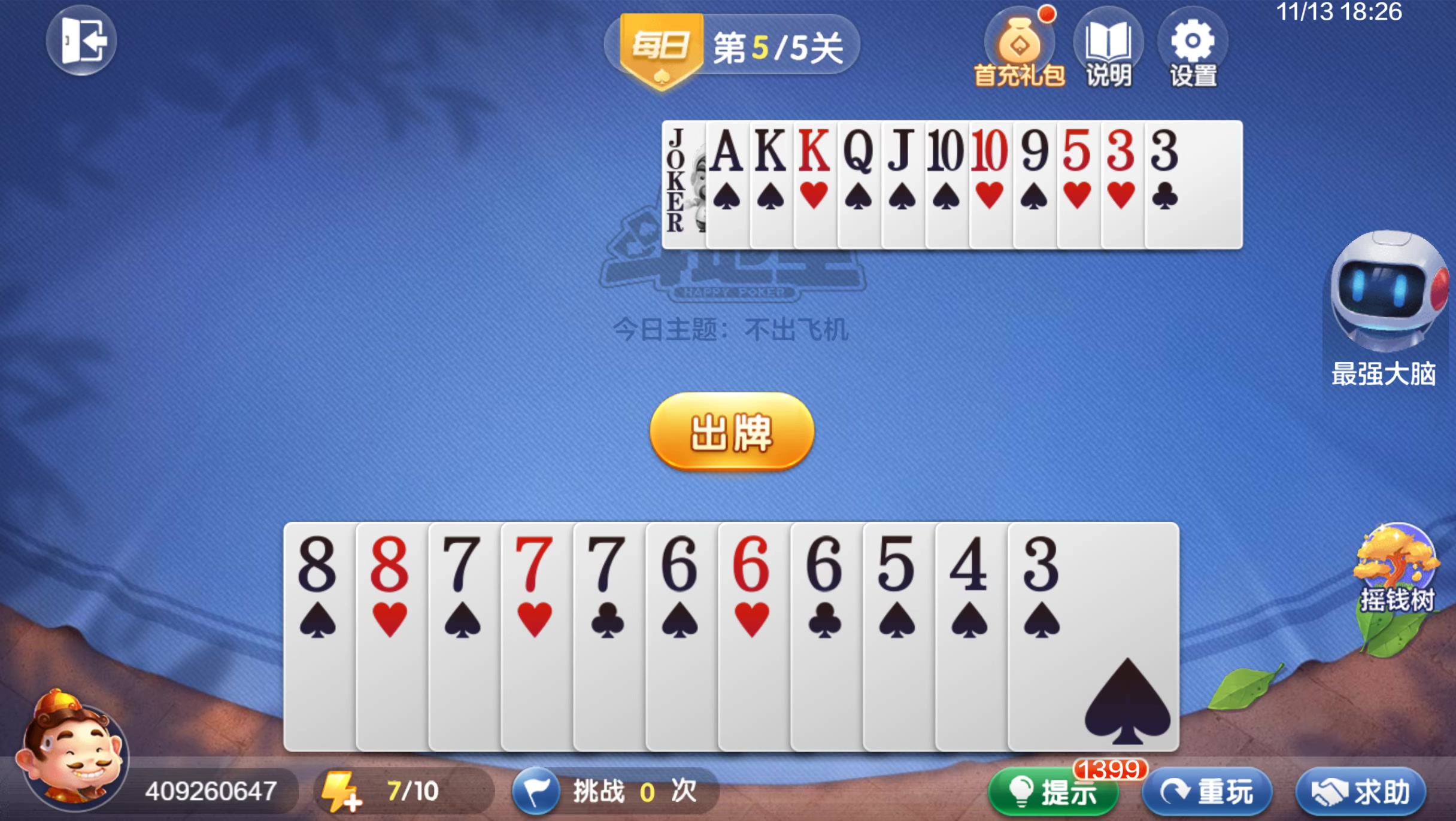 欢乐斗地主 残局 每日挑战 88777666543&X1KKQJSS9533