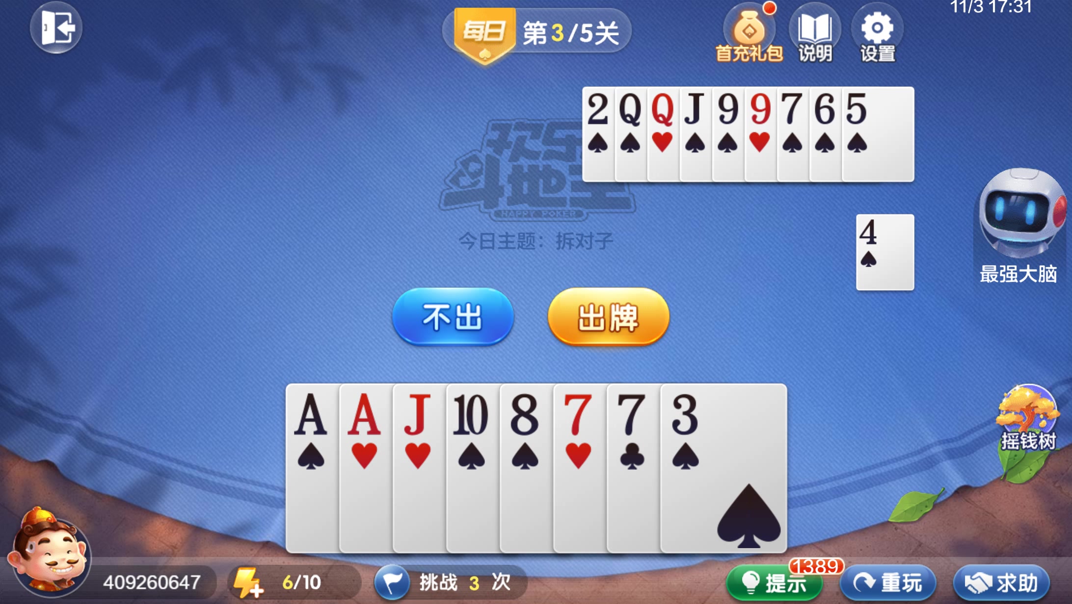 欢乐斗地主 残局 每日挑战 11QS98765443&21K877533
