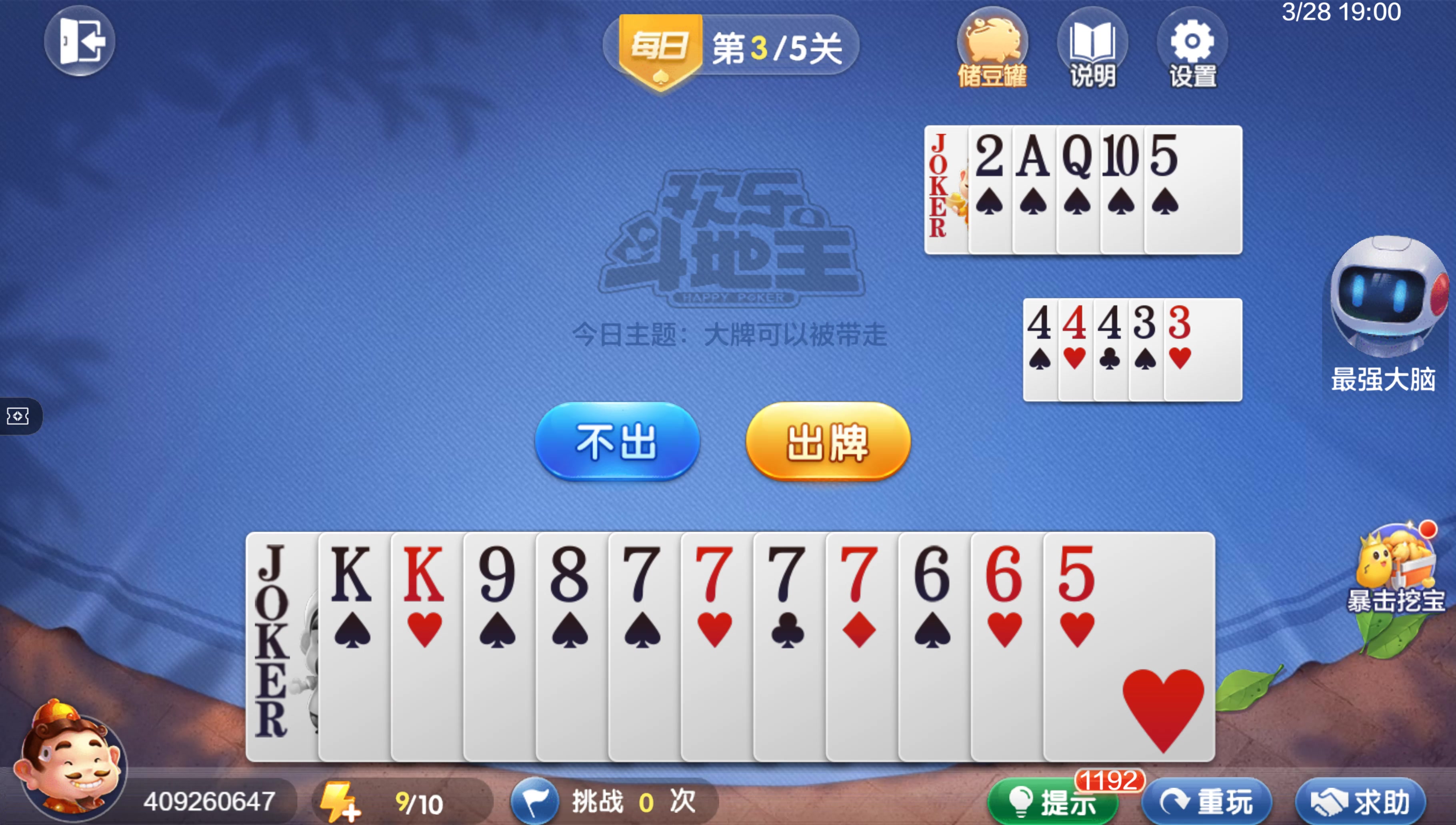 欢乐斗地主 残局 每日挑战 XKK866655544&D1QJ3
