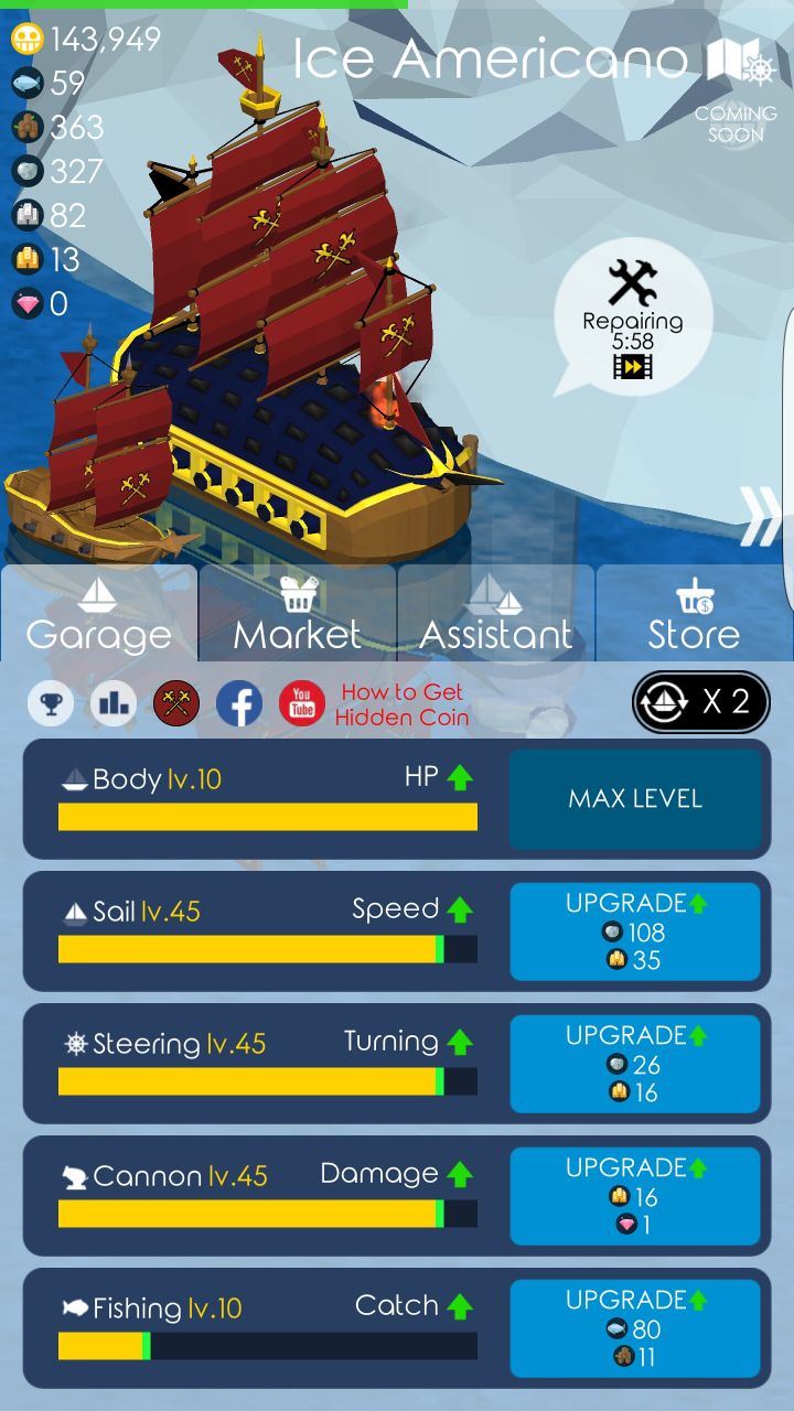 这游戏也完了一段时间了,前期就占岛屯资源,得到黄金,钻石什么的,先留着,因为到后期需要大量资源,后期木头石头什么的可以卖掉换钱。大炮升到46以后就需要钻石了,但都是自动攻击。帆升到46就没了,我也很好奇开发者的头脑。接下来附上8级9级10级图。