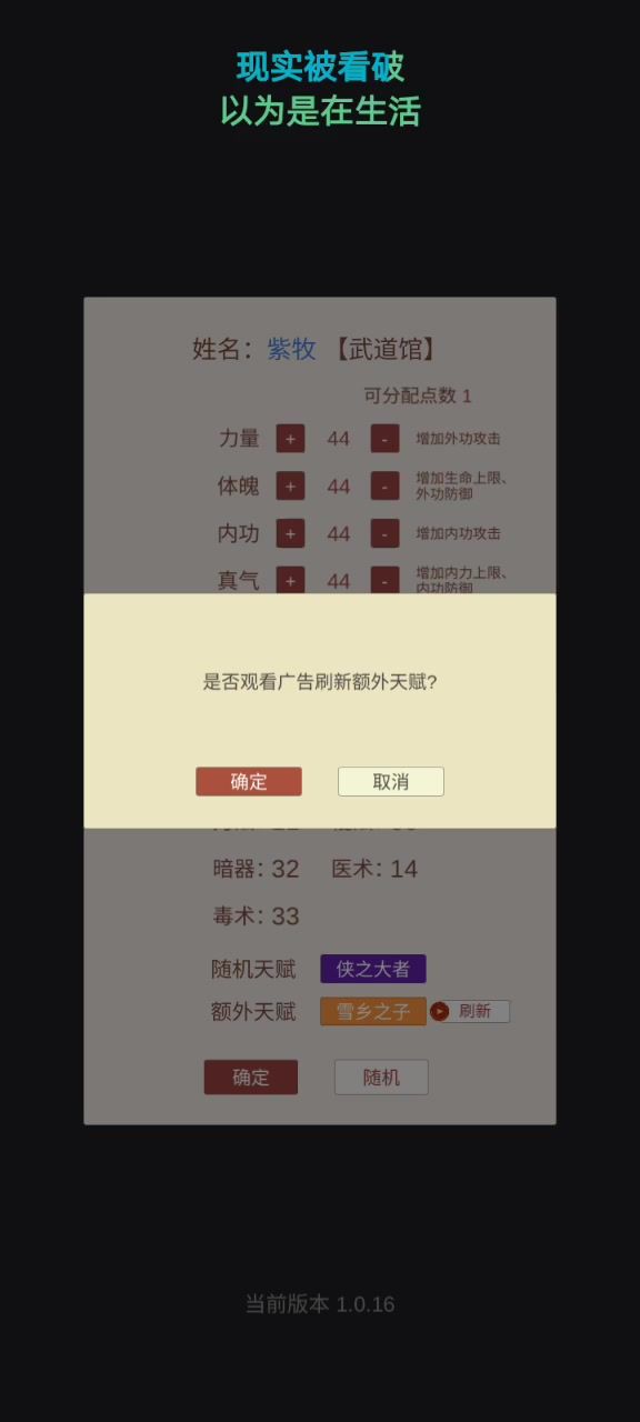 开局新建一个存档,刷个满意的天赋,进游戏点奖励看视频。重点来了,看8个修为+2个矿石的凑齐10个视频,弄出剩余免费的。然后手机备份游戏应用,回游戏点秘籍开刷,没出好东西就手机备份回档,回游戏开刷。直接省略看视频的时间。