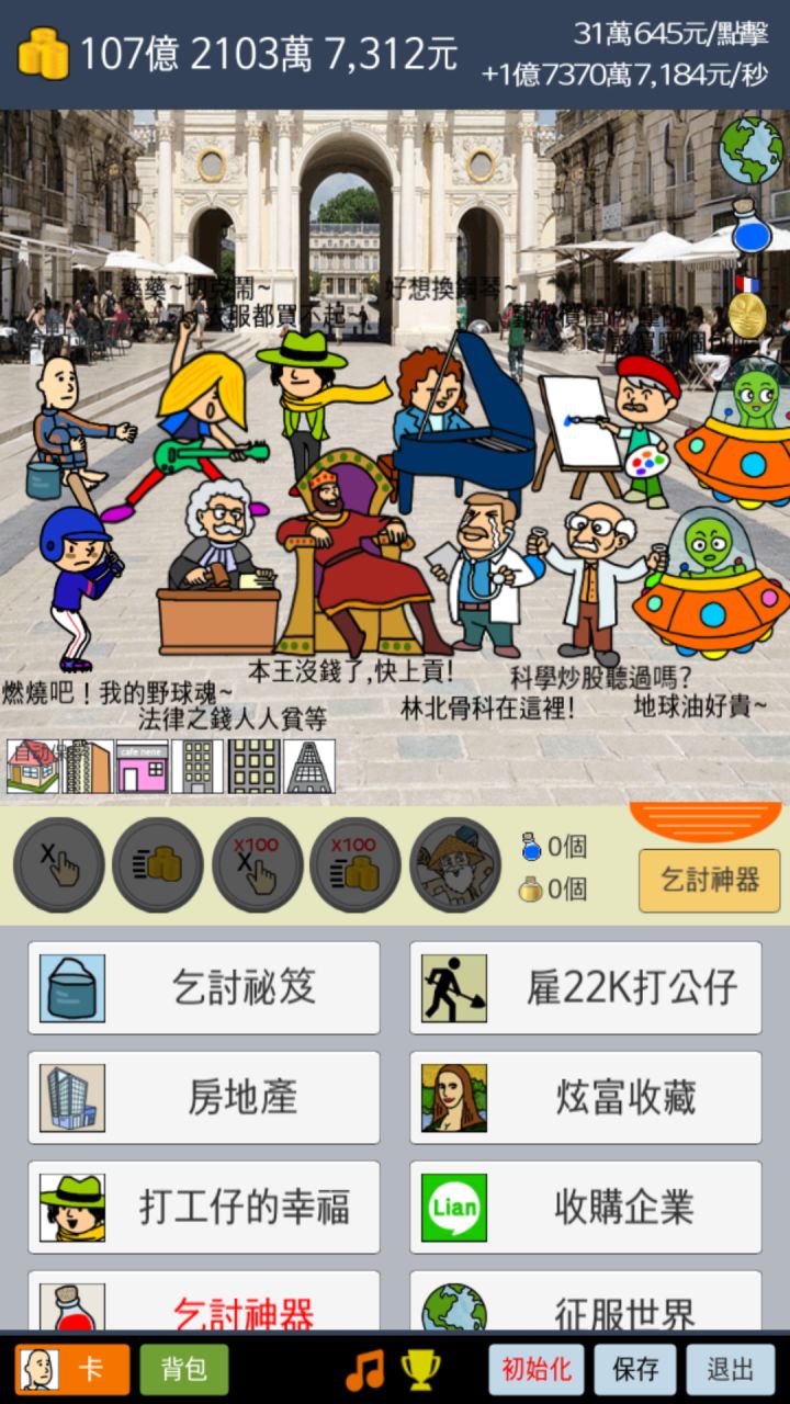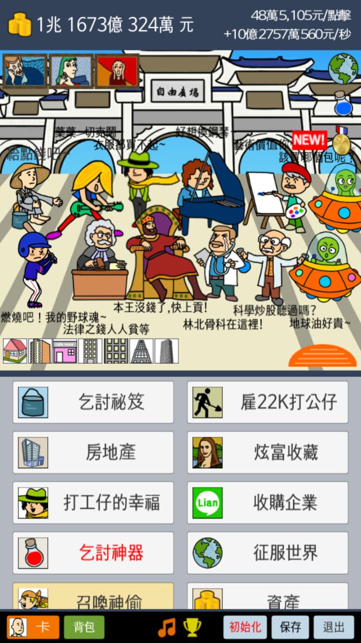 1,固定资产是可以出售再购买的,初期收益不高时可以利用反复出售购买获取资金。2,多完成成就获得蓝魔瓶,开金鼎是有几率出5个蓝魔瓶的,欧一点的话不会很亏。3,乞讨秘籍不一定要刷太高,重要的是打工仔,最好尽快开出女友,秒收益+1000%4,差点的资产不一定比好的收益差,举例,打工仔的幸福2兆的加5兆的,比7兆的企业秒收高1000万5,暂时就这些吧,有别的技巧请大神们补充,以上属于抛砖引玉😁😁😁