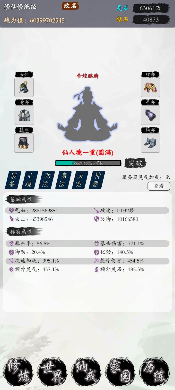 没有群不知道什么装B一区的真不给力,没氧过免广卡都没有,玩到现在就只看过52次广告,这等级就第4了啊,求道一级还差血量没蛮27%,你们装备没有全双灵气的吗?