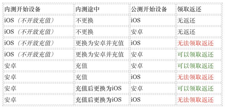 非常感谢您参加本次内部删档测试(以下简称“内测”)。参与本次内测,并在内测期间进行付费充值的玩家,只要在下次不删档公开测试(以下简称“公测”)期间使用内测时注册的账号登录手机游戏《粉碎狂热》,即可获得晶石倍数返还奖励。晶石返还奖励规则:内测期间付费充值的玩家,在公测期间使用内测时注册的账号登录游戏,将能获得晶石返还。在公测期间越早登录,将能获得更高倍数的晶石返还。请大家在公测期间尽快回到游