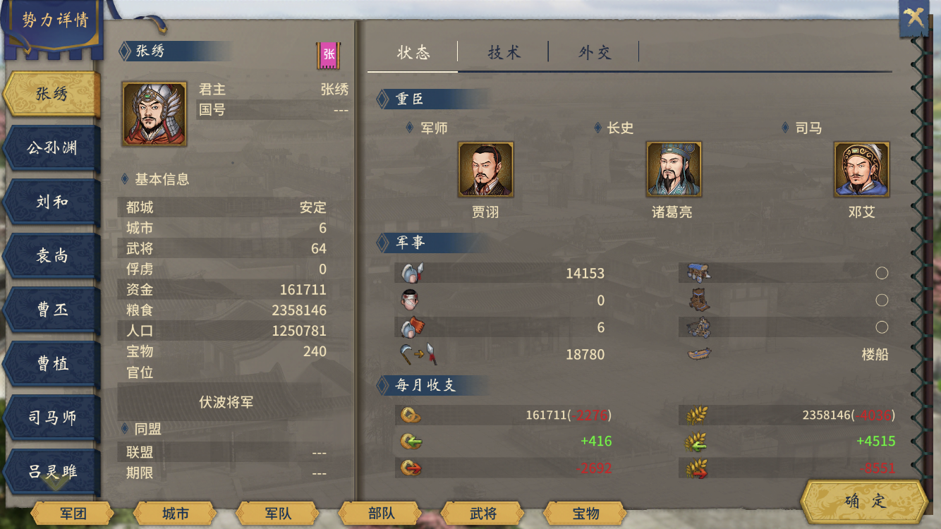 钟会的特技太好用了,尤其是局部小战斗简直无敌啊。这一把把曹丕养肥了等他灭了曹植就不好打了,得赶紧灭二袁了!下一步准备统一冀州,然后打下北平让给刘和,让刘和公孙渊互掐,幽州我就不要了,同时封他二人也会卢龙军节度使!替我守北疆哈哈!禁手动存档度过前期还是可以玩的,就是登人有点难受!s/l刷武器就更别说了……