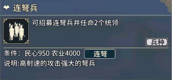 撰写:贴吧猫公爵殿下 弓兵系之一:连弩兵 推荐:★★★★★ 优点:攻击力最强大的兵种,随便突突一发就2000 的伤害,配合“齐射”基本上四队连弩一波可以秒掉任何一个满员部队 。再就是四个虎符,一次投入到战场的兵力充足,横扫千军 。 缺点:射程只有2,攻城和混战的时候经常打不到。防御力也是所有特殊兵种里最低的,不仅被砍比较疼,还经常优先被砍 。 使用:蜀中地区的刘家父子和入蜀之后的刘备都可以优先获得