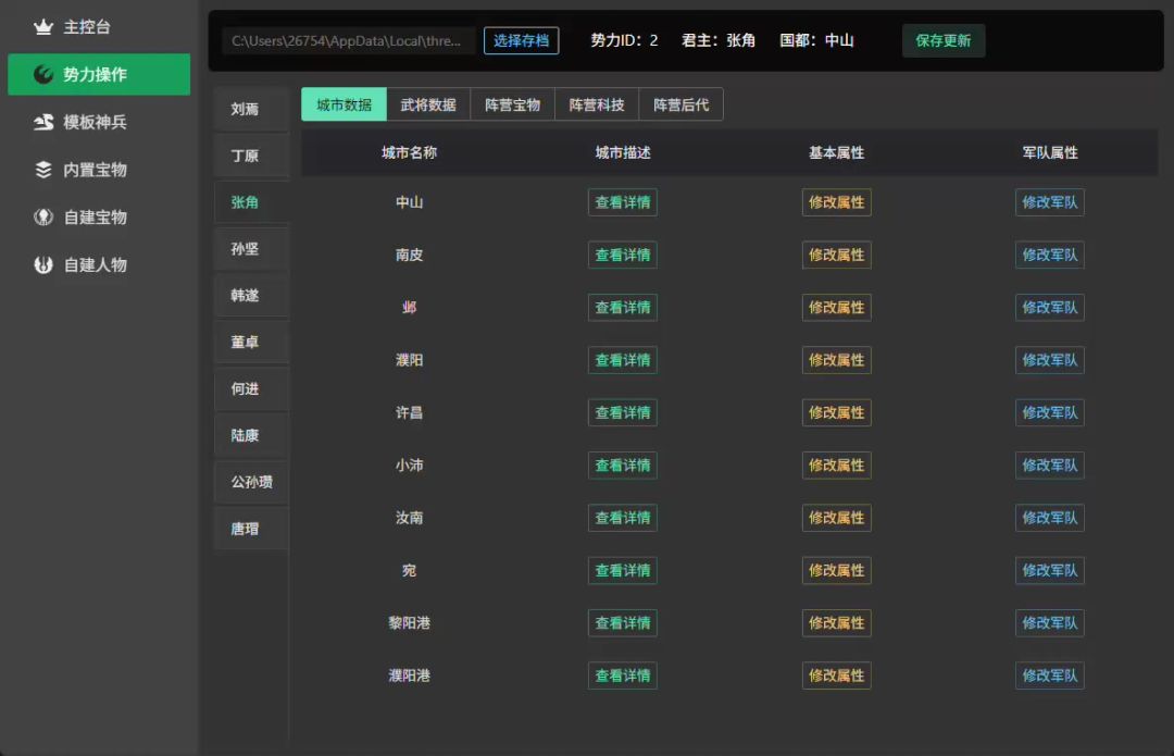 哈喽,各位论坛的小伙伴们大家好,今天给大家带来一期全量修改器的使用教程,因为我觉得功能还挺丰富的,所以就命名为全量工具了,经过大概两周的群内测试,群友们的使用手感反馈还是不错的,所以此贴献给所有热爱汉末霸业游戏的朋友们!下面按照图文并茂的形式一一带大家熟悉: 首先整个软件打开后是什么都没有的,我们注意到右侧顶部是主控台,我们应该先选择一个存档 存档选择完成之后数据便会载入,出现变化的就是控制台的主