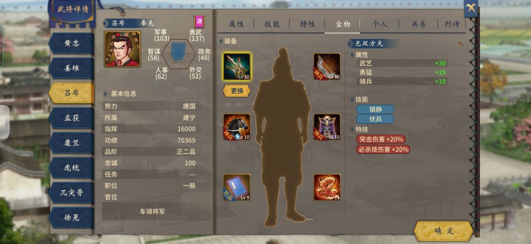 游戏里有吕布的专属套装,但是我觉得那玩意儿根本就不是给奉先用的🌚,所以我自己给奉先收集了一套完美穿搭 1.无双方天:游戏目前最高武艺的武器没有之一。吕布是主骑兵属性的,勇猛,骑兵,突击伤害都非常适合吕布,况且还加必杀技伤害,妈妈再也不用担心我打不过武道大会啦 (武道大会获取) 2.五芒:自造的一把神弓,箭术加15到达了最高值,奔射刚好适合吕布的骑兵,先发制人能提高单挑的时候先给对面来一发的几率,非