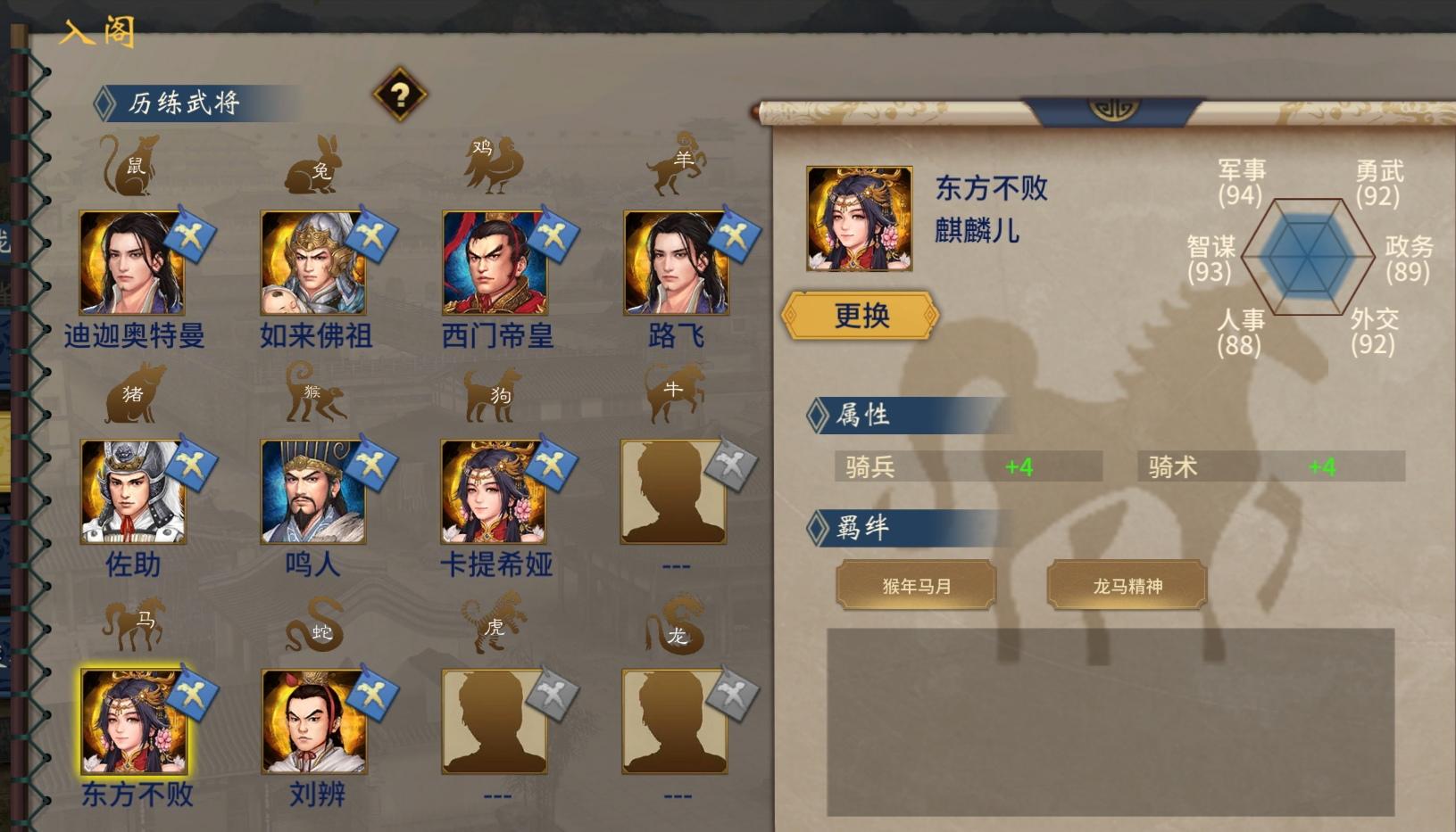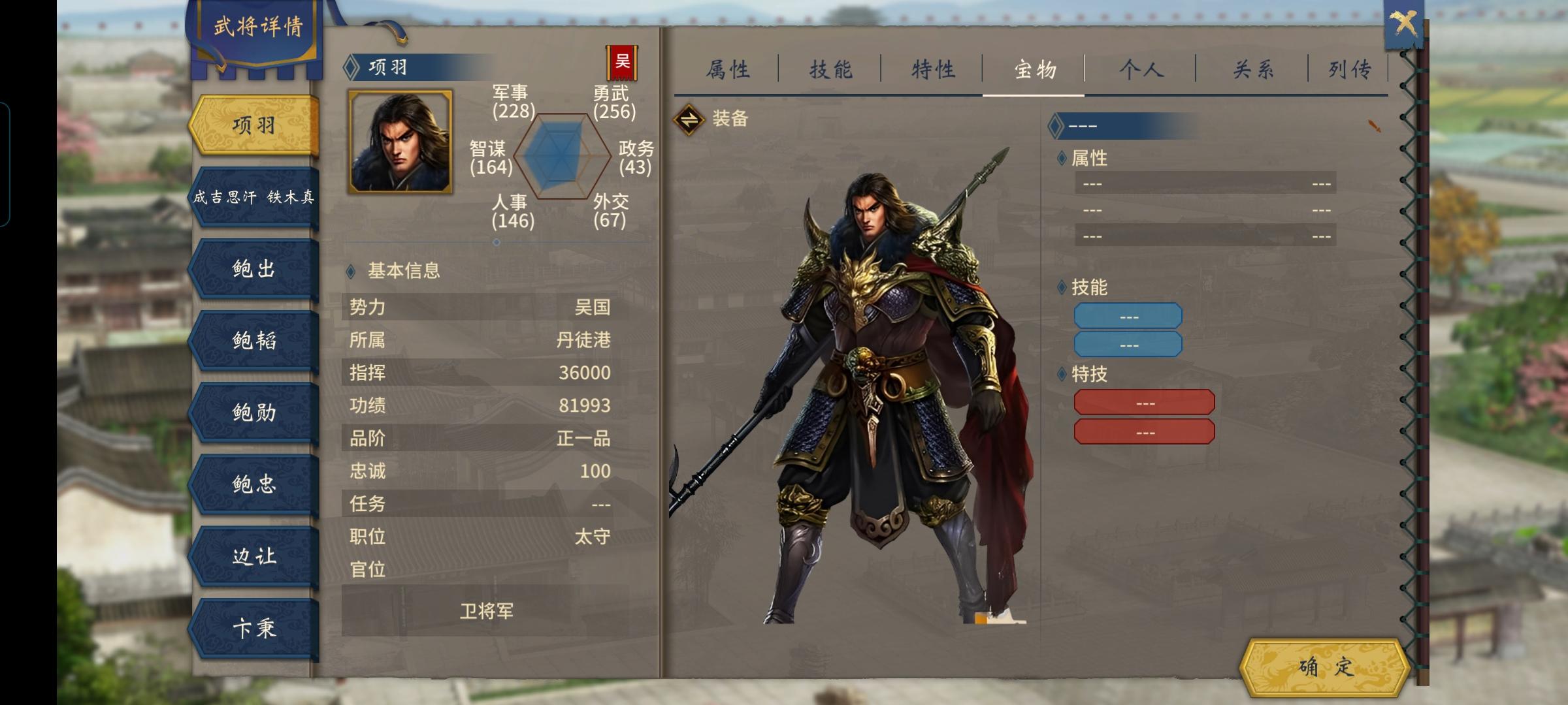 此次存档完善敌方成吉思汗皇太极等异族联盟势力成员特技,给项羽,朱元璋,李世民刘邦等势力某些成员补齐套装,给三国某些名将补齐特技,这次还分享各种立绘资源,有三国杀风格,有神三国式立绘等,另外需帮弄DLC和存档的可在群里交流,DLC可修改英灵阁属性,新建武将属性,新建宝物属性,直接飞升神将,神器,通用全剧本! 更新:完善程普陈宫等原角色立绘,增加新建女武将立绘,和三个自建男角色立绘,各位可以为自己的