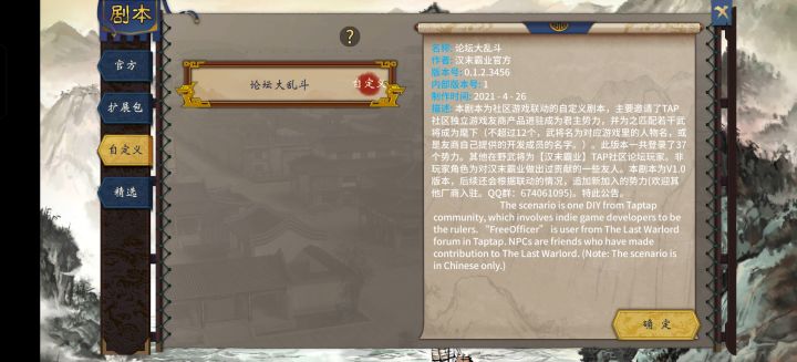 朕自登基以来,励精图治,历二十载光阴,内安群臣,外除鞑虏,终使我汉室疆土除西北马腾尽皆收复。然因一场意外(指特意将恶行改为99999),诸臣叛乱,各地太守均纷纷自立,终使我硕大疆土分崩离析。朕之所在仅余一城4关 朕上愧天地,下愧黎民。噫吁嚱,朕是否还能重振旗鼓,再造天下呼。![[表情_吃瓜]](https://img.tapimg.com/market/images/d07b262774c8a022a7dddbc39683da6b.png)