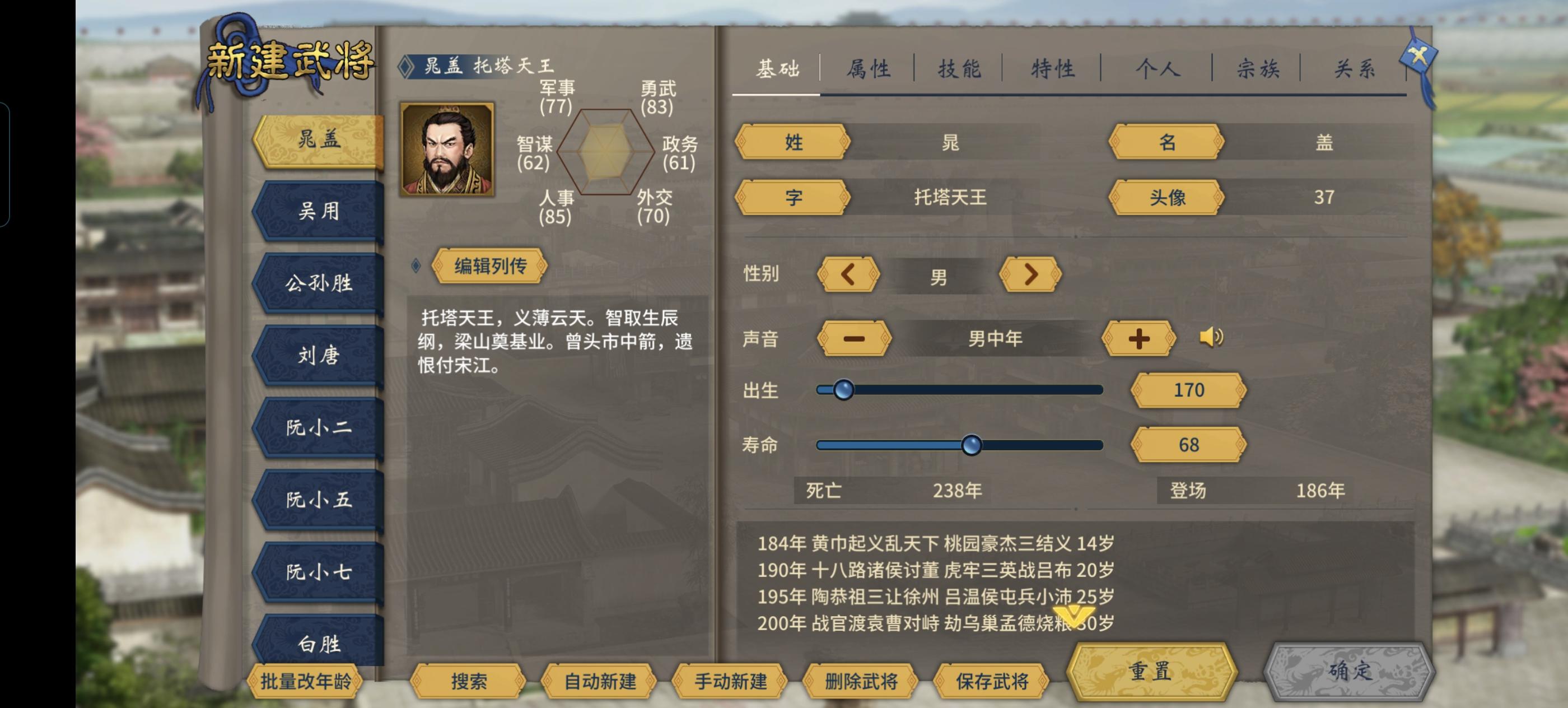 #汉末霸业山寨武将 自己做的水浒传108将和天王晁盖,头像用的现成的,但也是精挑细选。数值是靠AI分析的,做了好几天,自己亲测,极个别有数值怪,基本还是平衡稍弱一点的,想分享给大家,不知道能不能上传啊。