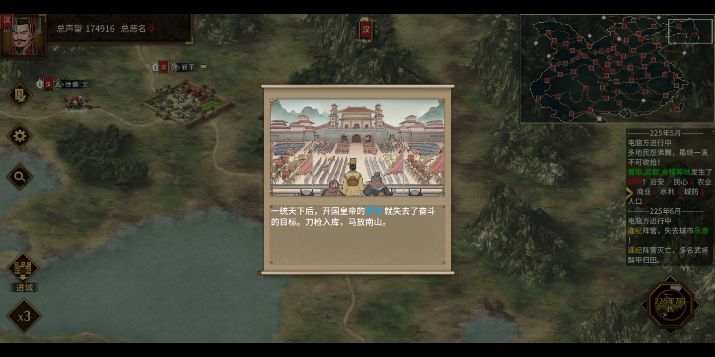 一开始我以为一统天下后不会直接触发结局,本来还打算好好休整一下再开结局,结果直接二世而亡了。我的大功臣诸葛亮都没有上功臣榜,备愧对孔明甚矣!
