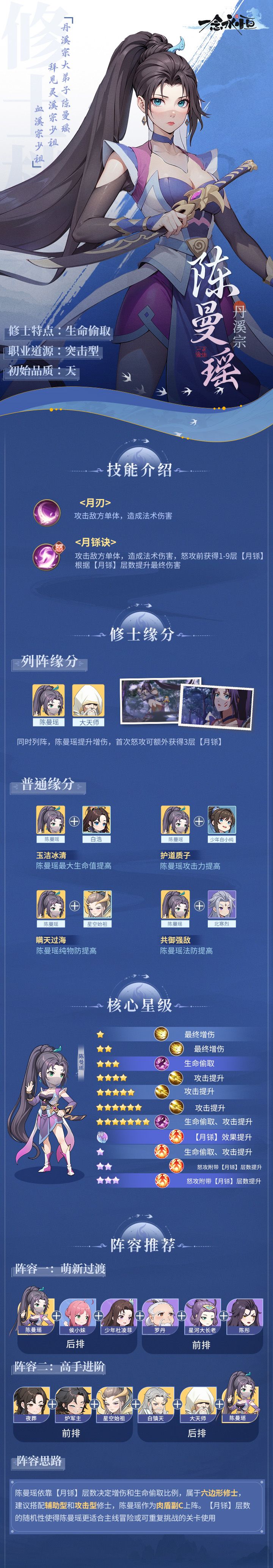 陈曼瑶,蛮荒魁皇城天师的弟子。 作为暗子潜伏在丹溪宗,四宗合并后作为白小纯护道者进入星空道极宗。 ▌陈曼瑶 游戏定位是生命偷取、攻击叠加,怒攻后发动的【蛮荒魂印】可以吸取目标生命值,并根据获得的【月铩】层数获得攻击力提升。与大天师同时上阵可提升增伤,并在首次怒攻势额外获得3层【月铩】,搭配神话三星的被动技能可在首次怒攻稳定获得6层【月铩】。 ▌怒攻展示 攻击敌方单体,造成法术伤害,怒攻前自身获得1