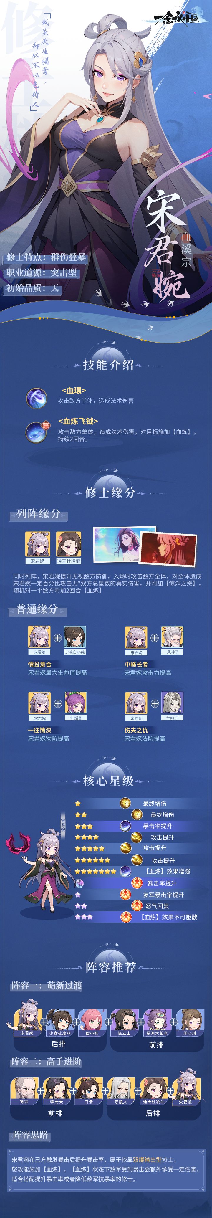 宋君婉,血溪宗中峰大长老,同时也是宋缺的小姑, 因拥有着一副优越的皮囊,又居于高位的她,惹来了宗门内不少议论。 ▌宋君婉 游戏定位是群伤叠暴,怒攻会攻击敌方单体,并对目标施加持续2回合的【血炼】,处于【血炼】的目标受到暴击时,额外承受一定真实伤害。修士3星后其他友方触发暴击时,宋君婉自身会提高一定暴击率,持续到战斗结束;神话级【血炼】效果提升,并且我方修士攻击处于【血炼】目标时暴击率得到提升,以