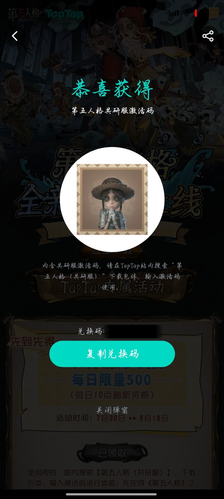 终于抢到第5人格共研服激活码了