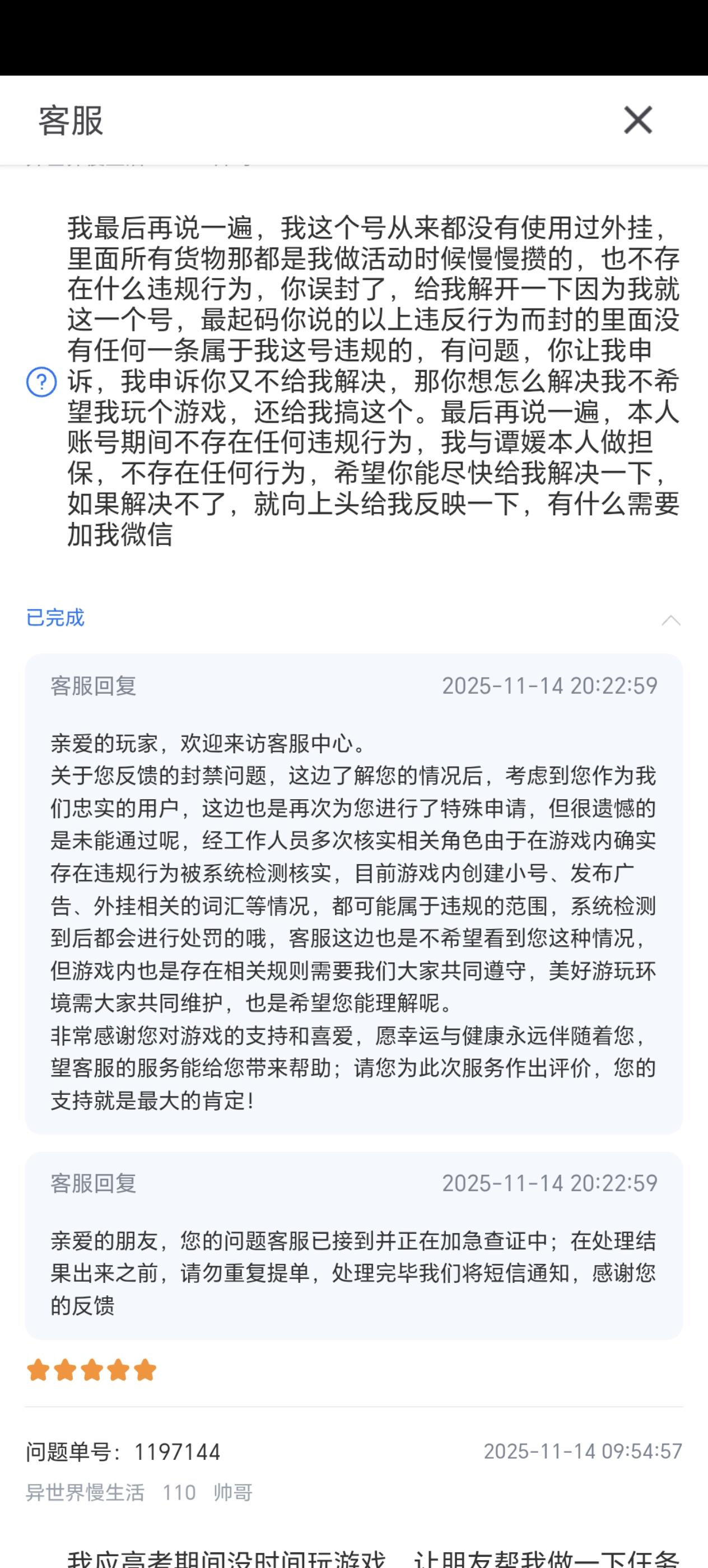 你好开你开的时候去反馈说我开外挂,现在又给我说是账号异常,我就这两个号怎么可能开小号,另一个号还是随手创的新手期都没过,什么东西都没解锁,我就这一个号里面所有货币都是我自己慢慢刷的慢慢干的非说我使用别的什么东西?