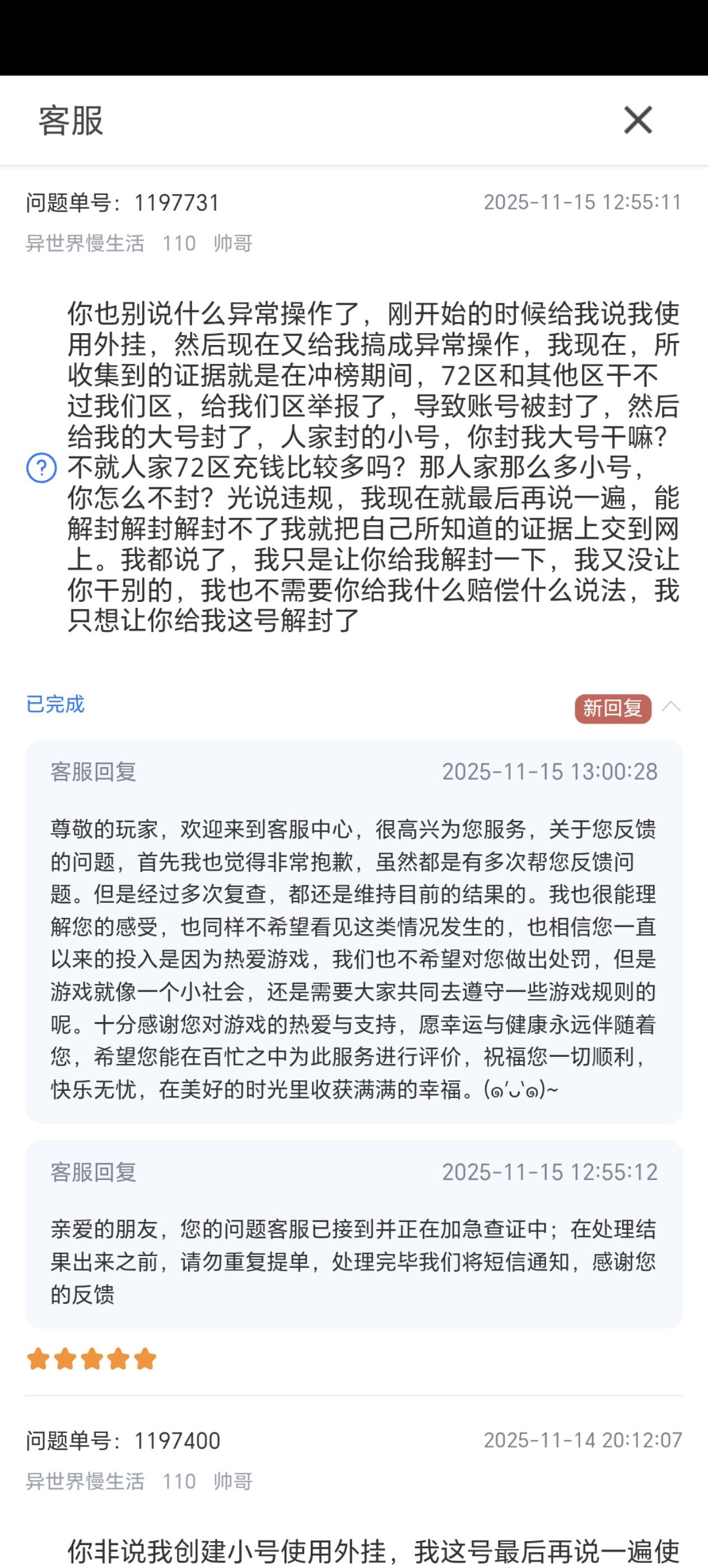 氪金的就牛逼,就不管我们反馈了,也不听就是不给解封,以前还说我有外挂行为,到最后干脆连外挂行为就不说了,就说解封不了。你一个玩游戏,官方的解封不了吗啊?玩不起就别做游戏好吗?回外服好好去吧