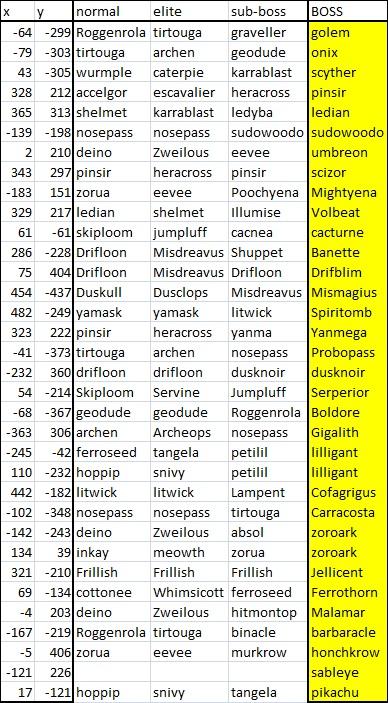 献给想完成4岛图鉴的朋友们(其实是给我自己看的,做好了就顺便发上来活跃下论坛 XD)直接点完以下所有坐标,就能抓到4岛所有的宝可梦啦!不过还差1只铁壳蛹(Kakuna)找不到,有找到的宝友请务必分享给我,嘻嘻