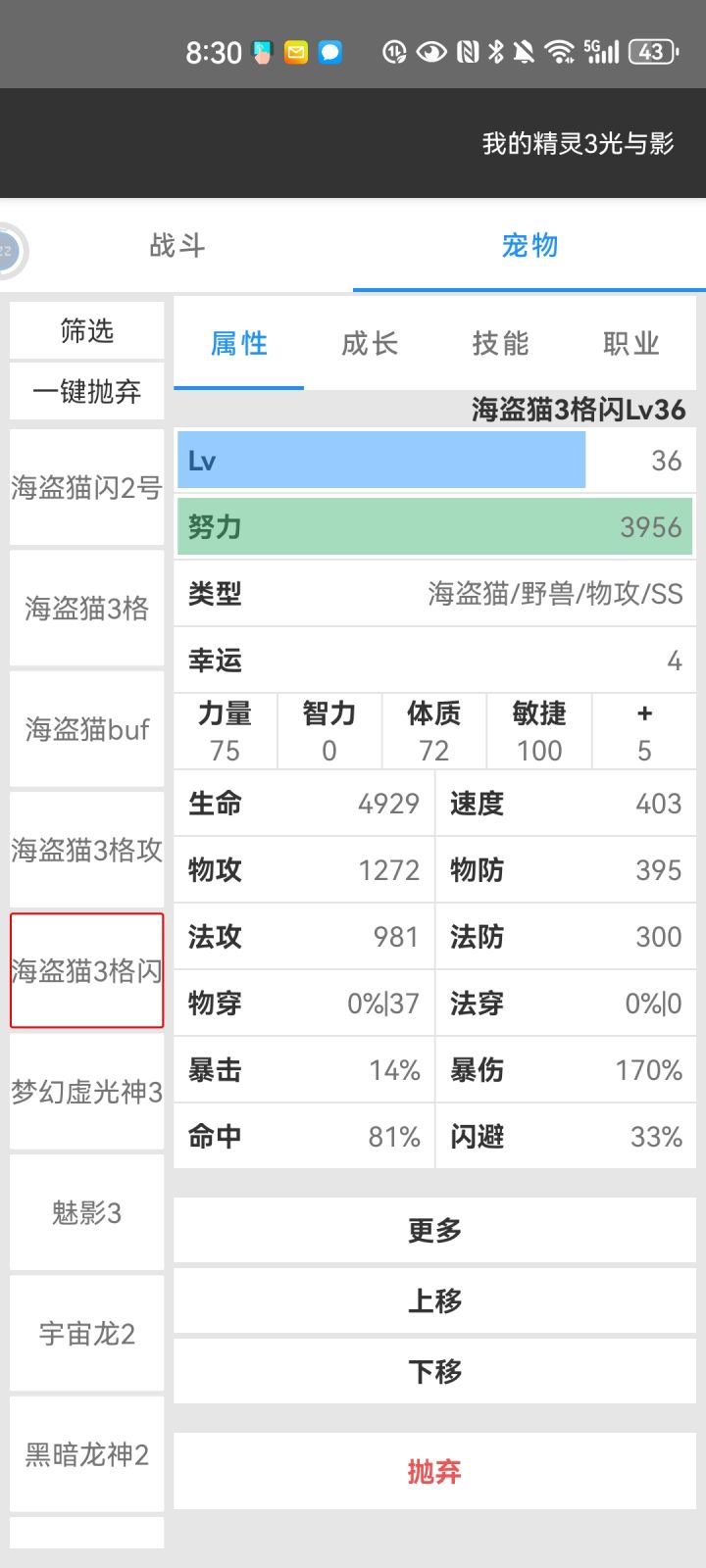 通关大概需要练到35-40级,提高恢复能力和抗揍能力,能够吃鸡就OK了。可以看到最后一关我输出不高,全靠对面自相残杀。比较推荐的初始单位是【海盗猫】,可以一路用到死,抓3个职业格子的,最好闪避天赋高的,不停更新资质就行(资质主要看力量、生命、躲闪)。职业使用【愿挨者】,【抗揍者】,【闪避强攻者】(闪避不高的用【挨揍狂暴者】)。加点的话闪避高的【加100敏捷】,再加【力量】。闪避不高的直接全加