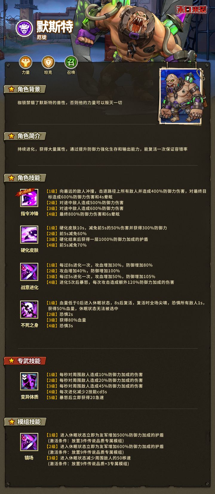 今是愉快的周五,明天就不用上班了~,依旧是我给大家带来最新的角色情报前瞻。最新消息《末日来袭》将迎来新厄徒【默斯特】,预计5月26日会在幸运夺宝活动中获得。默斯特可持续进化,获得大量属性,通过提升防御力强化生存和输出能力,能复活一次保证容错率,详细技能描述看下方信息。注:未在游戏内实装的内容,最终实装效果以游戏更新公告及游戏内为准。以上就是本次报道的内容,想知道最新的消息幸存者们记得关注我