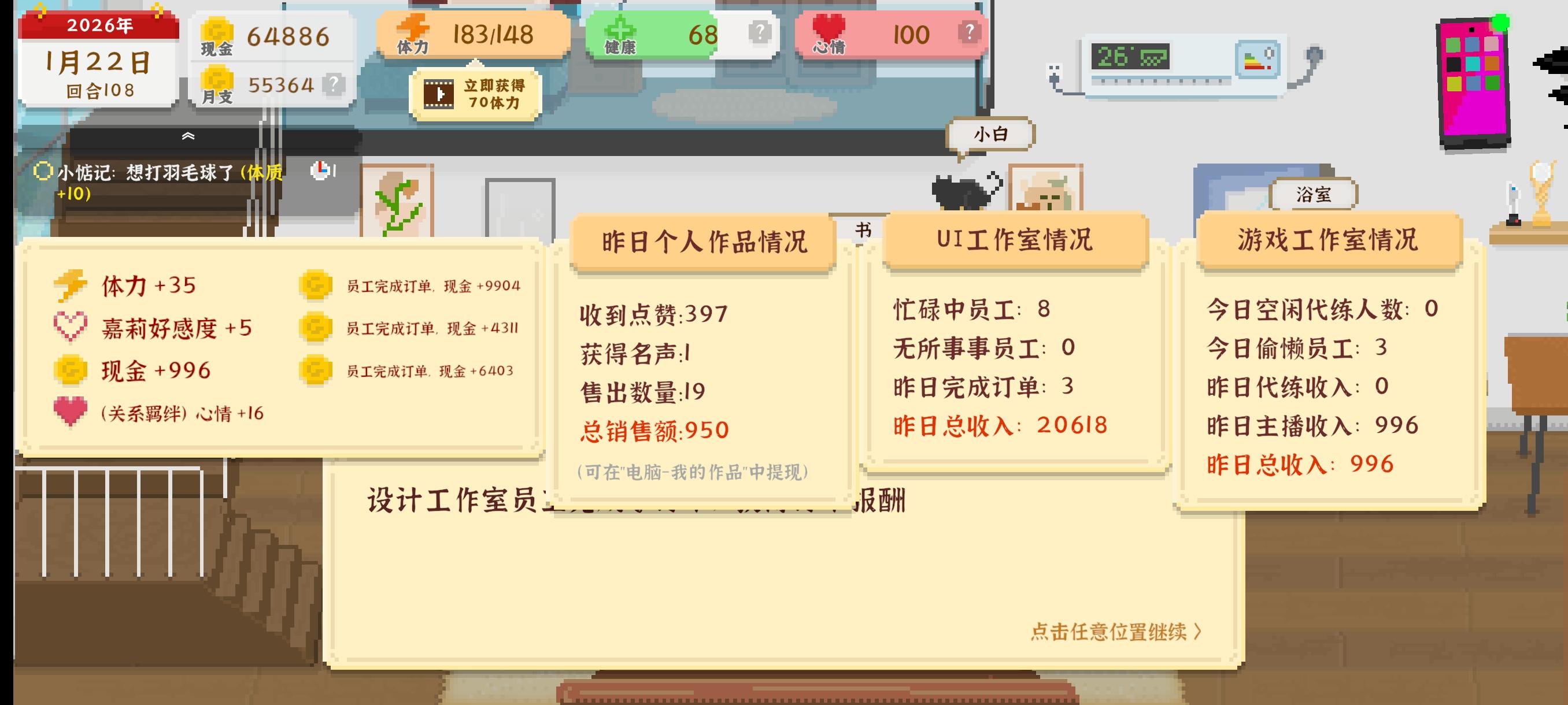 情为何物 : 个人感觉游戏路线是最简单的,而且消耗健康和心情最少,每天都不用动,只用去集市买菜或者干脆吃外卖也行,操作很简单,就是有点无聊,每天就是三个事,之前看别人先做设计,个人感觉完全没必要,第一次做设计直接给我干死了,一直扣健康和心情,走游戏路线建议别打排位(没任何用),前期一定要熬夜学习游戏知识,可以解锁一个高级连招,非常有用,大概充到2w血就能拿全国第一了,也不用看广告,非常简单