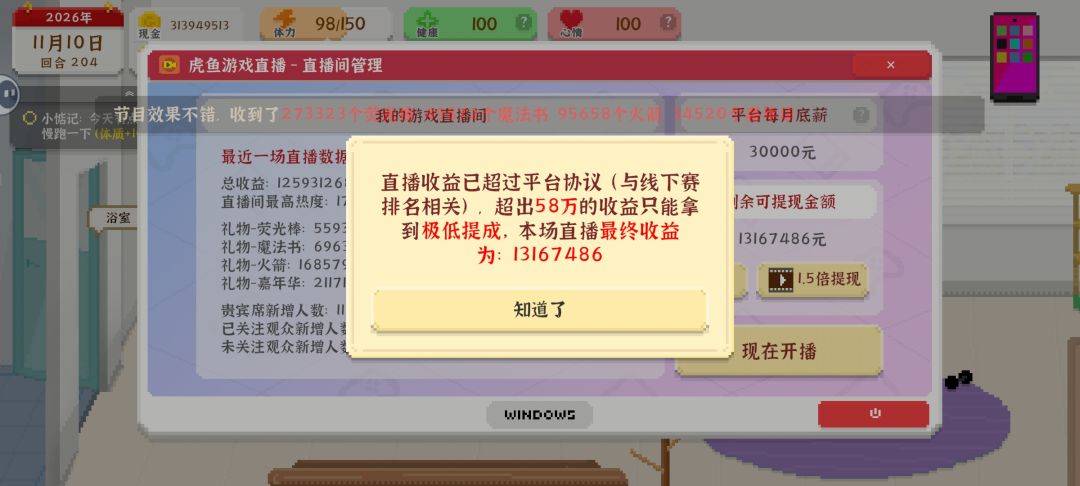 先简单讲一下我的打法吧 开局先把体质拉上来,然后就是一直搬砖,每天起床之后先磕药,健康不够就跑步,实在不行去医院 我的顺序是锅-动感单车-专业跑鞋-自行车-铂金表 每天做菜就卖猪肉,不要舍不得那点钱 单车的目的是把体力上限快速拉满顺便拉一下体质,还可以给一些健康,我是每天两个都做了 跑鞋是用来拉体质的,还可以减少跑步的体力消耗,在拿到铂金表和跑鞋之后就不要长跑了,适度慢跑性价比会更高一些,慢跑的特