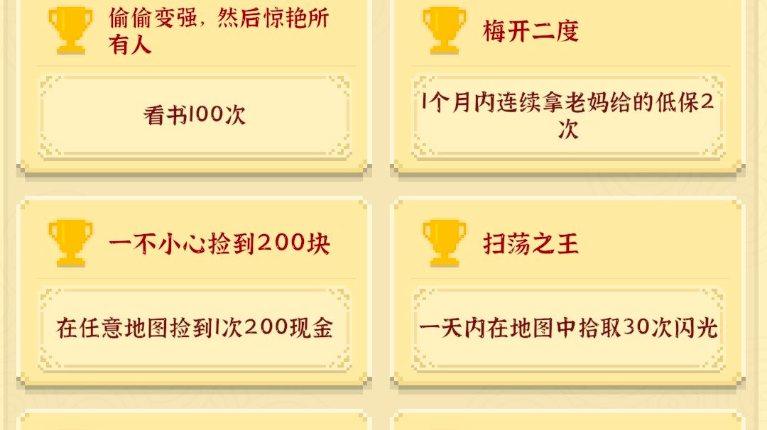 一次过全成就~ 开局最需要注意的就是带有几回合内的成就!! 这些回合内成就都是指开局前几回合!! ①比如佛系种地,20回合内不用肥料,指的是开局20回合内不使用化肥,这个开局跟主线开荒土地然后种上植物就可以了,后面不管它,哪怕不去维护土地,到20回合可直接完成成就。 ②然后就是20回合心情不低于60,30回合健康不低于60,心情低可以喝奶茶,洗漱,健康低就去打篮球,吃药,稍微注意一下就行,尽可能不