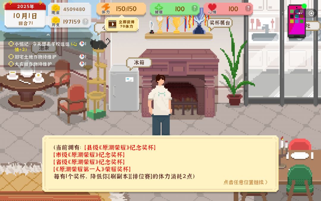 通过开农场赚钱 -写不下了,删了又删,注意事项及其他内容会另外发一个帖子 前期(开大农田之前) -第一回合 -开第一块地顺便准备*完成有对象任务,父母会给的一万元*(第八回合出现母亲的消息,“回复:要啊”,开启任务) 做法: 一、去“家乡旧宅”开地,这时体力不够种地可以通过“在手机点外卖”来补充,这样在第一回合,种“水果作物种子”,在手机-网购中补充种子便宜。 二、在“家乡旧宅”遇见“朴素女孩”,