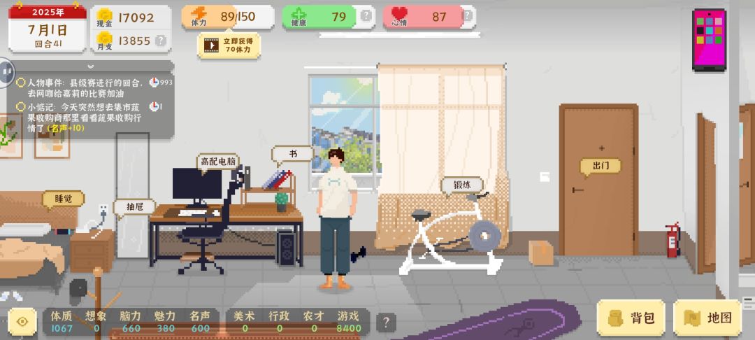 首先健康低就去高级中学打篮球,开局没解锁的话先跑跑步,心情低就在家里沐浴或者在电脑上打游戏。另外地图见闪光就摸,可以用来稍稍补贴一下 体力回复见我上一个帖子 1.在开局第一天先去广告店和家乡老宅解锁小花和艾薇,这两个人物前期挑一个保证每天聊天(建议艾薇)因为后面有个任务需要你找到对象,父母会给一万元,另一个随便聊聊(有好感度可以每天加心情) 2.开局优先美术开局最好(开局考公极易扑街),开局先看书