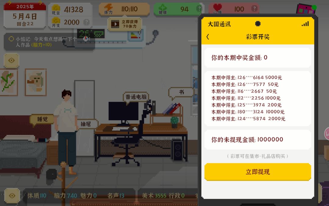 开局去梭哈2000块,然后多打工,第二天亏得多直接重开,亏得少去打工买100的,赚了继续梭哈。 注:1.攒50000块任务尽量做,给车。(小花结局减轻压力) 2.老哥的钱一定要借,双倍必还。 3.这种打法走哪条线都可以,钱越多越好。#我独自生活彩票中奖 # 做完50000块任务后,每天买20000的彩票,没几回合就中了。