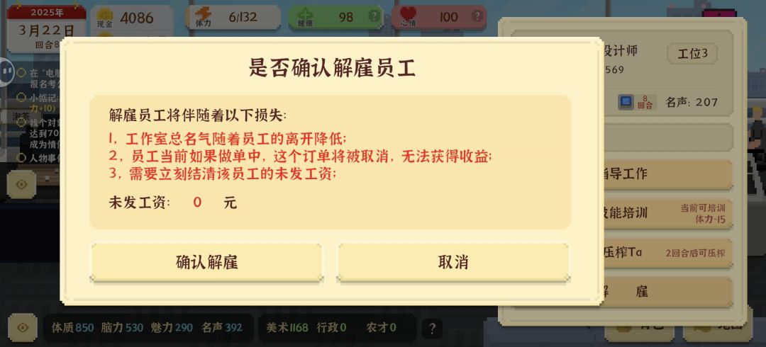 我摊牌了,我脸都不要了[表情_坏笑],我直接0元购好吧[表情_看我的]。招聘初级员工,指导+压榨,一回合就能做完一个设计,然后直接解雇,当天解雇不需要工资,白嫖捏🤏。每个工位的压榨cd是两天,两天可以这样操作8次,白嫖10000+。不过不能一直白嫖,还是要培养自己的高能力人才,所以每天只招募最有性价比的那个初级员工就行了,每天培养一个,一边白嫖一边招募,八天就能组建最有性价比的员工团队。 压榨虽好