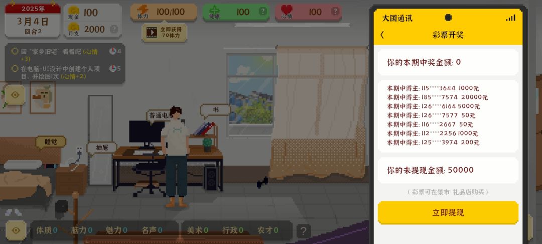 开局有钱抽彩票,依赖的都是运气,彩票需要在集市里的一个礼品店,才能购买。 因为我开了无数次游戏,终于发现游戏的核心玩法。 开局我们可以节省更多的钱!也就是种地!美术和考公,要想不看广告,必须就是种地,0 成本 0 起点。 考公:都需要花费不少钱去学习,大家也发现了,考公肯定是要看广告的,而且必须把网购里的东西,全部购买完毕,才适合考公。况且属性要很到位,最花钱,最烧钱就是考公。当然后期就很轻松。属