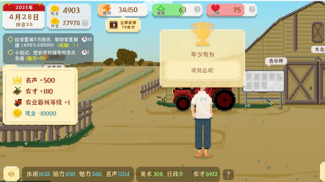 找了半天没有年少有为详细攻略,于是自己打一个。结合前几局的经历和大家的经验贴,选择通过种田达到6666,终于成功了哈哈哈哈哈哈!!!(燃起来了!) 「20回合内不做多余的事情,围绕体质和农才展开行动。」 一、体质决定农才。 每天早上先去种田,再去搬砖赚钱(加体质 钱也多),有钱先买水果种子和肥料。 「1、种子和肥料」 前期网购水果种子(网购75)、肥料(网购200),在集市遇到低价粮可提前购入屯着