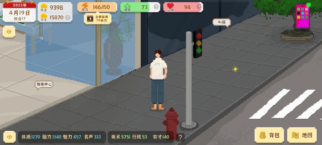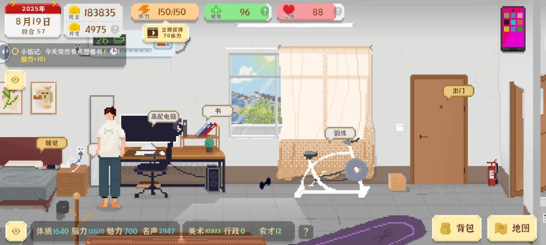 首先细说下三大路线(不打工)(打工是不可能打工的)。 种地,考公,UI设计。。。。。 首先前期想拥有大量资金的话,那必定首选UI设计,开局啥也不用管,先设计500评分的作品,之后出售(定价随意)(健康掉了就去吃药)。 之后就是帮人设计(设计的首先看好是自己的,还是帮别人的),获得一些初始资金,就该去找女朋友(买礼物,谈话好感度拉到70准备)。 体力全部消耗在锻炼身体上(150体力是不大,需要吃饭)