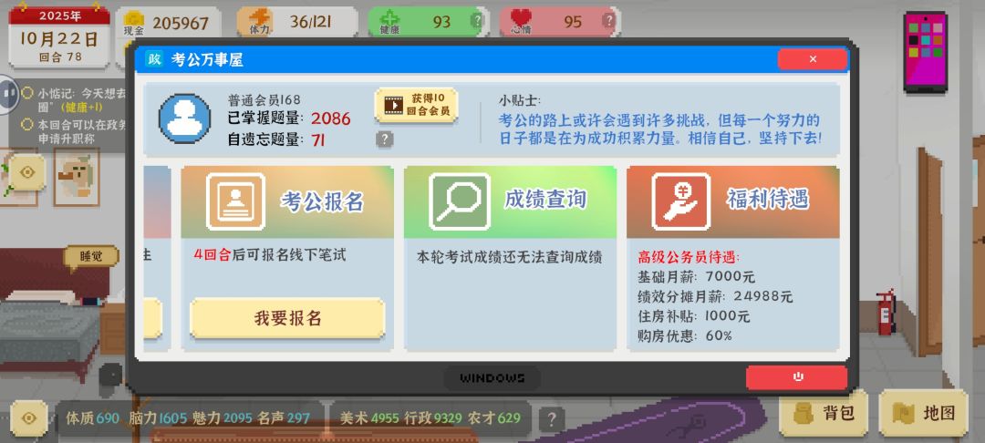 开局刷小花好感度到70拿保底一万买考公视频和教辅第二次公考刷题到3000考公90分面试三道题100分解锁国之栋梁打卡上班帮同事速刷魅力行政值15回合升到顶官买房和小花结婚速通。