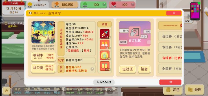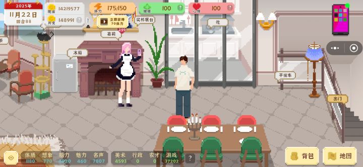 先说整体评价,还是比较满意的,经营养成类游戏 然后有相当于四个职业可以选和发展。我走的设计 农业 游戏三条路,本来10小时就可以结婚了,但是我自己犟想拿游戏世界冠军,硬多玩了三个小时。然后分享个我第一次通关的转折点:是父母任务 欠了70000块需要我们还 但是实际上攒够了也不用给他们,任务完成后七万块钱保留的情况下还送辆车 跑图直接0体力。然后七万块钱直接足够我们把公司和房子的所有设施全买了,因