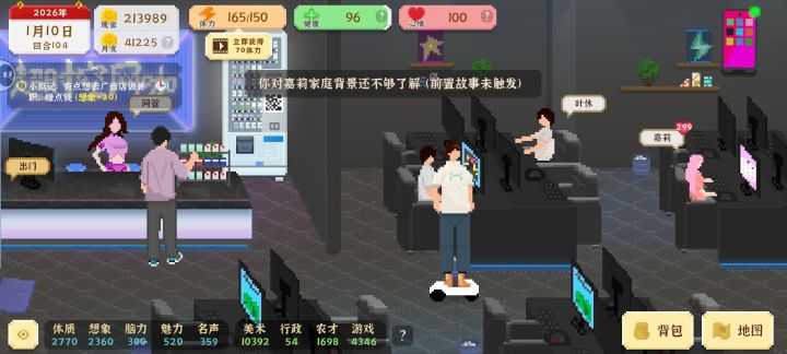 开局选择电竞。一直刷经验。买电脑。买同步器刷钱。不断的氪金。然后打比赛。有了原始资金之后。开电竞。工作室。招聘。直播天赋高的。不断叠加原始资金。然后就财富自由了。最后再考公。学校的座椅和双杠。可以恢复体力。工作室可以。购买按摩椅。小猫可以通过集市的临时商人购买猫粮。多喂几次,这个猫就跟你走了。但是你要买一个猫爬架。前期的健康可以通过跑步或者打篮球恢复