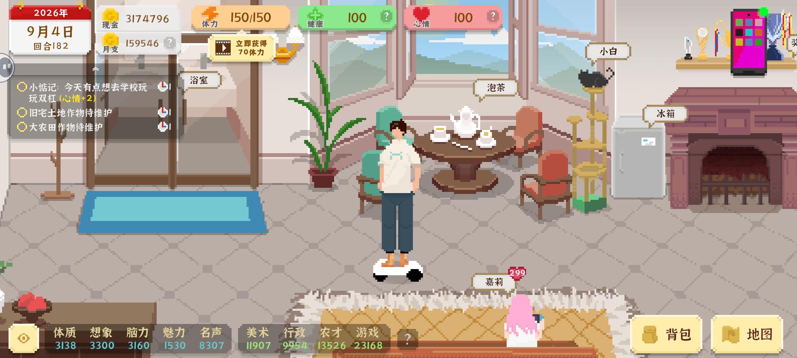 前期不会玩,情侣也没搞到,7万也没拿到手,还差点病死,还好后面赚了钱当上老板才好起来。建议早点开游戏工作室,自己的游戏可以不着急玩,然后选直播天赋高的员工,天赋10的员工,打赏47万,可以每局获得11万,8个主播员工就是88万。
